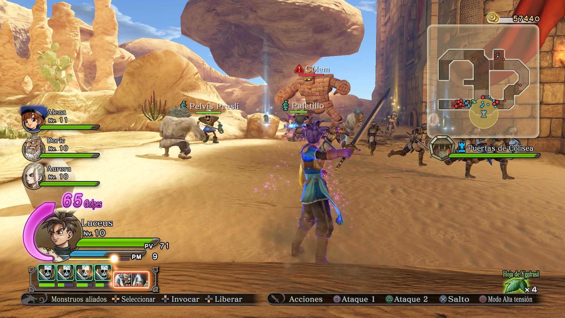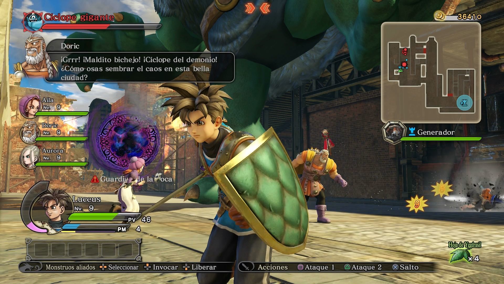 Las batallas contra los jefes finales también tienen cierto componente estratégico, y por ejemplo conviene utilizar los inventos de Aila, mecanismos especiales como balistas o máquinas lanzaconjuros que encontramos en los escenarios y que vienen muy bien para golpear con toda la fuerza contra los puntos débiles de los jefes. También hay estados perjudiciales durante los combates, como veneno, sueño, sello, etcétera, y podemos resucitar a los aliados si caen luchando. Como veis no falta ninguno de los elementos habituales de un Dragon Quest, tanto dentro como fuera del campo de batalla.