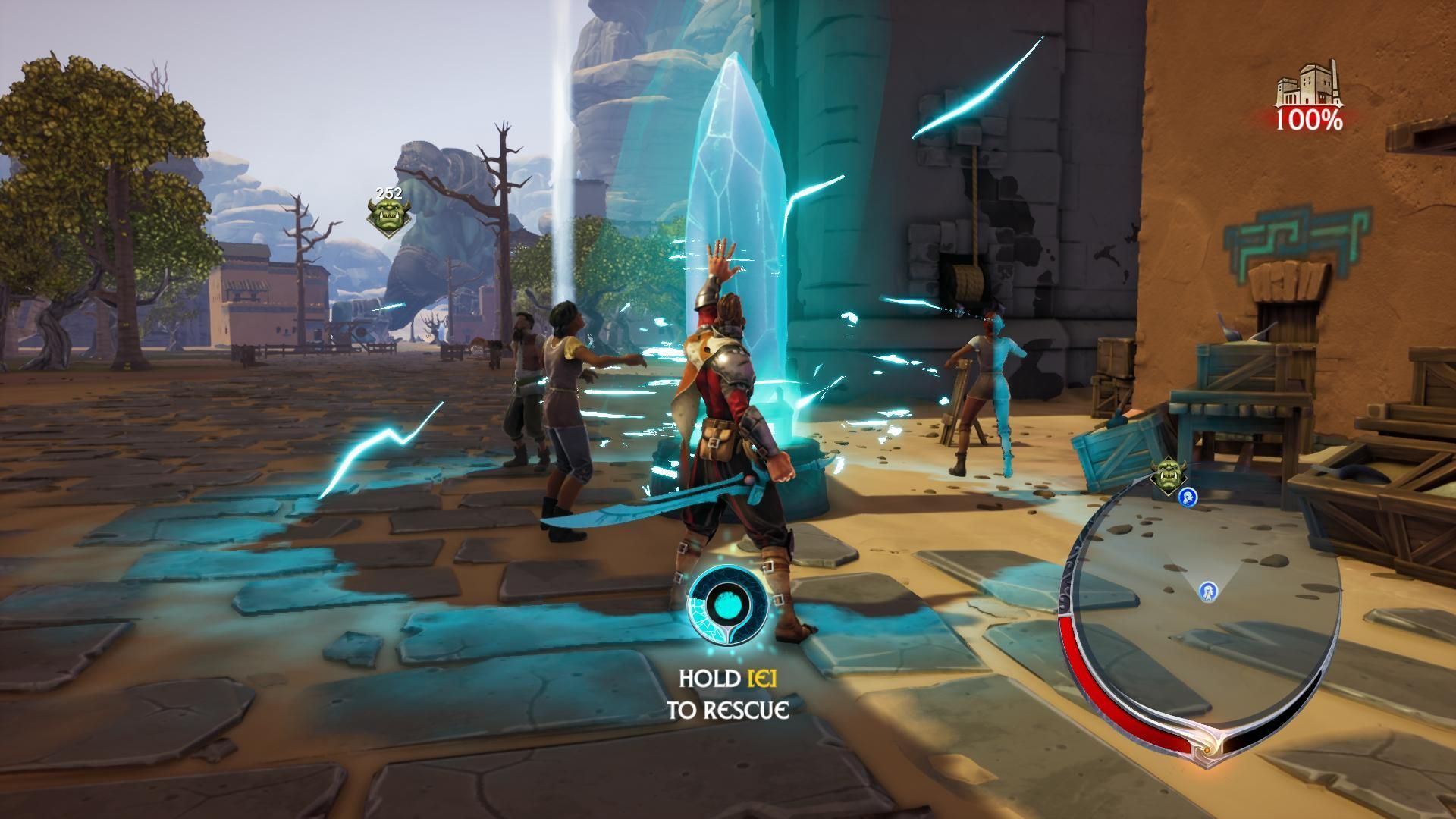 La gente se sitúa cerca de unos cristales de teletransporte que les llevan a un lugar seguro; para activarse, necesitas mantener un botón pulsado durante segundos en los que quedas desprotegido. Mientras, los enemigos nos pueden atacar o matar a los civiles, por lo tanto conviene despejar la zona. Nuestra salud en estas situaciones no corre demasiado peligro, pues hay autorecuperación pasados unos instantes, pero la población sí que muere al recibir unos pocos ataques. Durante esta primera fase del combate nuestro objetivo es ese: salvar gente, eliminar enemigos que pongan en peligro su salud y acumular suficiente energía.