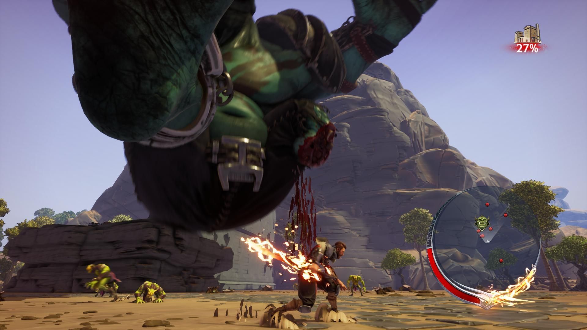 Se hace difícil hablar de Extinction sin mencionar Attack on Titan, así que cuanto antes lo hagamos será más fácil describir lo nuevo de Iron Galaxy: la defensa de aldeas y fortalezas de orcos gigantes, seccionando sus extremidades para subir al cuello y ejecutar un golpe de gracia que corte su cabeza. ¿Suena o no muy parecido?