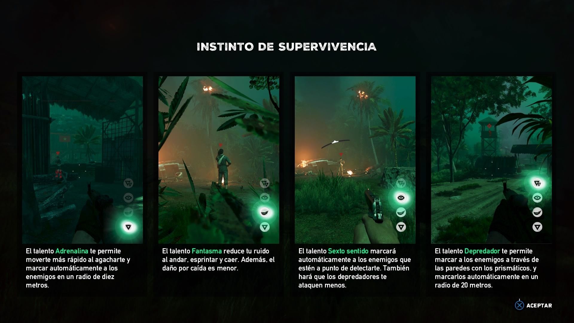Se llama Instinto de supervivencia, y busca fomentar el sigilo y los ataques silenciosos por sorpresa, eliminando de un plumazo cualquier otra táctica más bruta o escandalosa. Esta habilidad tiene varios grados de mejora, que se van consiguiendo si atacamos y realizamos asesinatos sigilosos entre las tropas del Viet Cong. Ya sea atacándolos por la espalda o golpeándolos con armas cuerpo a cuerpo, iremos consiguiendo nuevos talentos que nos proporcionarán una serie de ventajas.