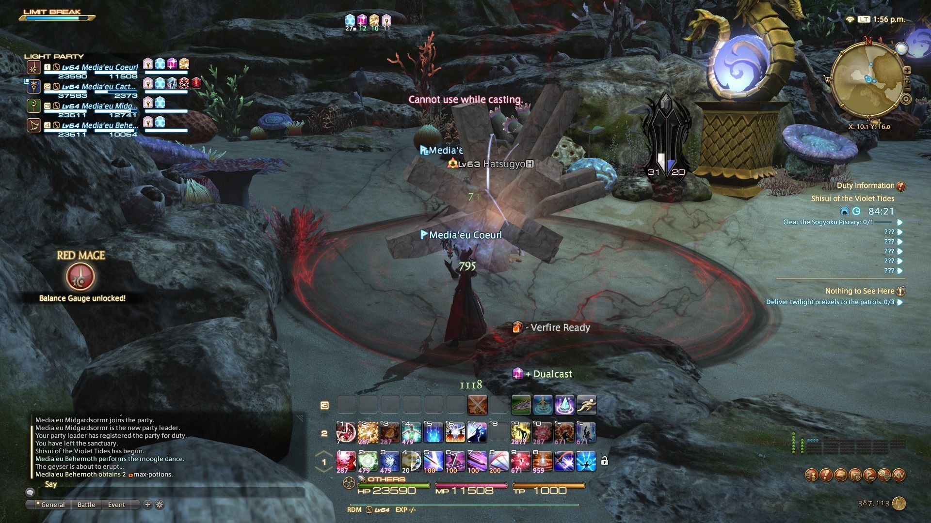 El Job Gauge del mago rojo son dos barras simétricas, llamadas Balance Gauge que se rellenan según utilices, respectivamente, magia blanca o negra. Cuando las dos están llenas sirven para iniciar un combo de habilidades que hacen bastante más daño del que inflige el arma habitualmente, pero es importante para que sea efectivo subir ambas barras de forma paralela.