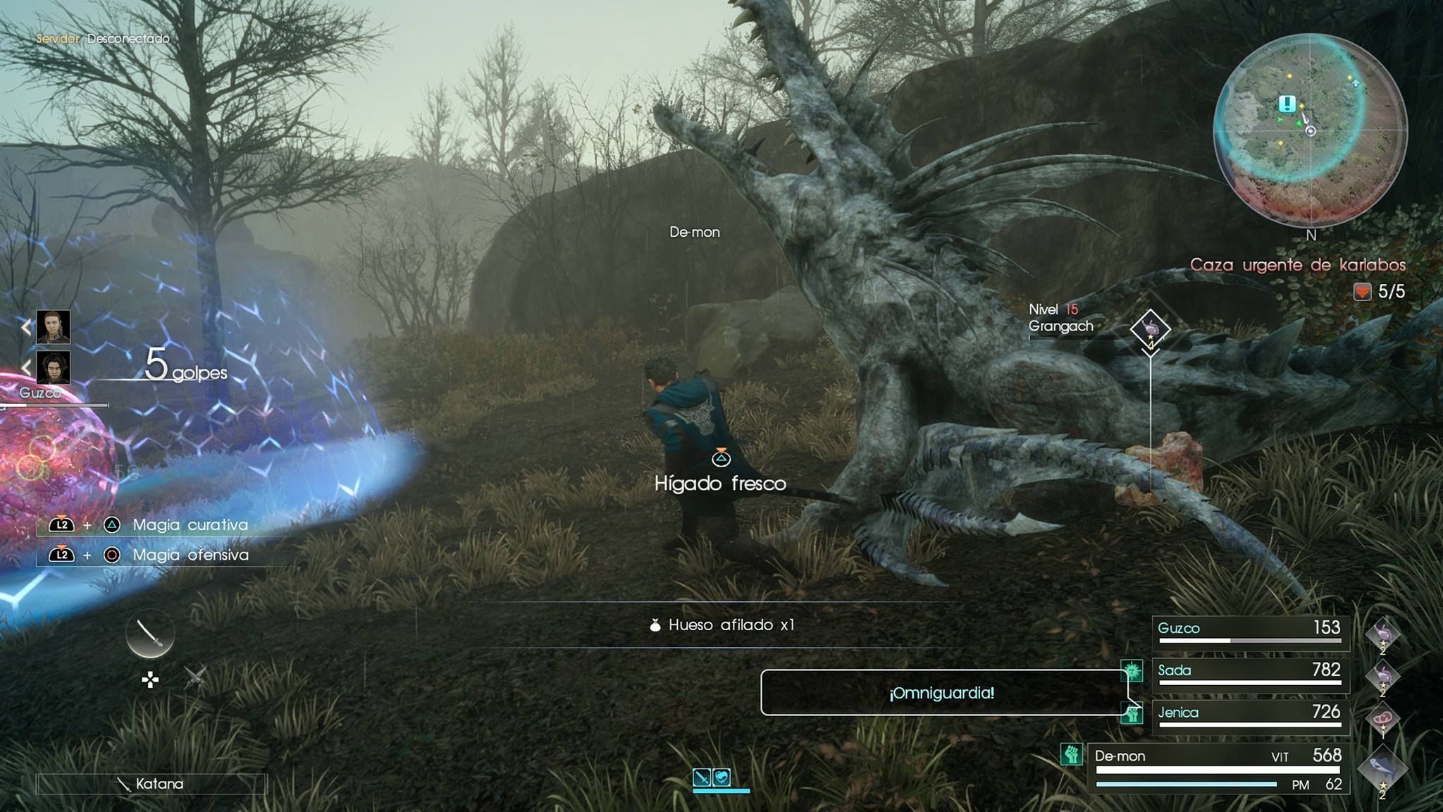 Si bien los Glaive comparten muchas habilidades con Noctis –incluyendo la característica teletransportación lanzando dagas o la materialización de armas-, se nos explicará que hay algunas diferencias en el combate. La primera es que ahora no se utilizan ítems; en su lugar, los avatares se apoyan mucho más en las magias. Hay magias curativas, para nuestro personaje y cualquier compañero en un radio cercano, y otras ofensivas que no funcionan como las granadas de Noctis, sino con una barra de puntos mágicos. Esto es mucho más cercano a lo que esperamos de un RPG, y en nuestra opinión mejor que el tema de extracción y fabricación de consumibles de Noctis.