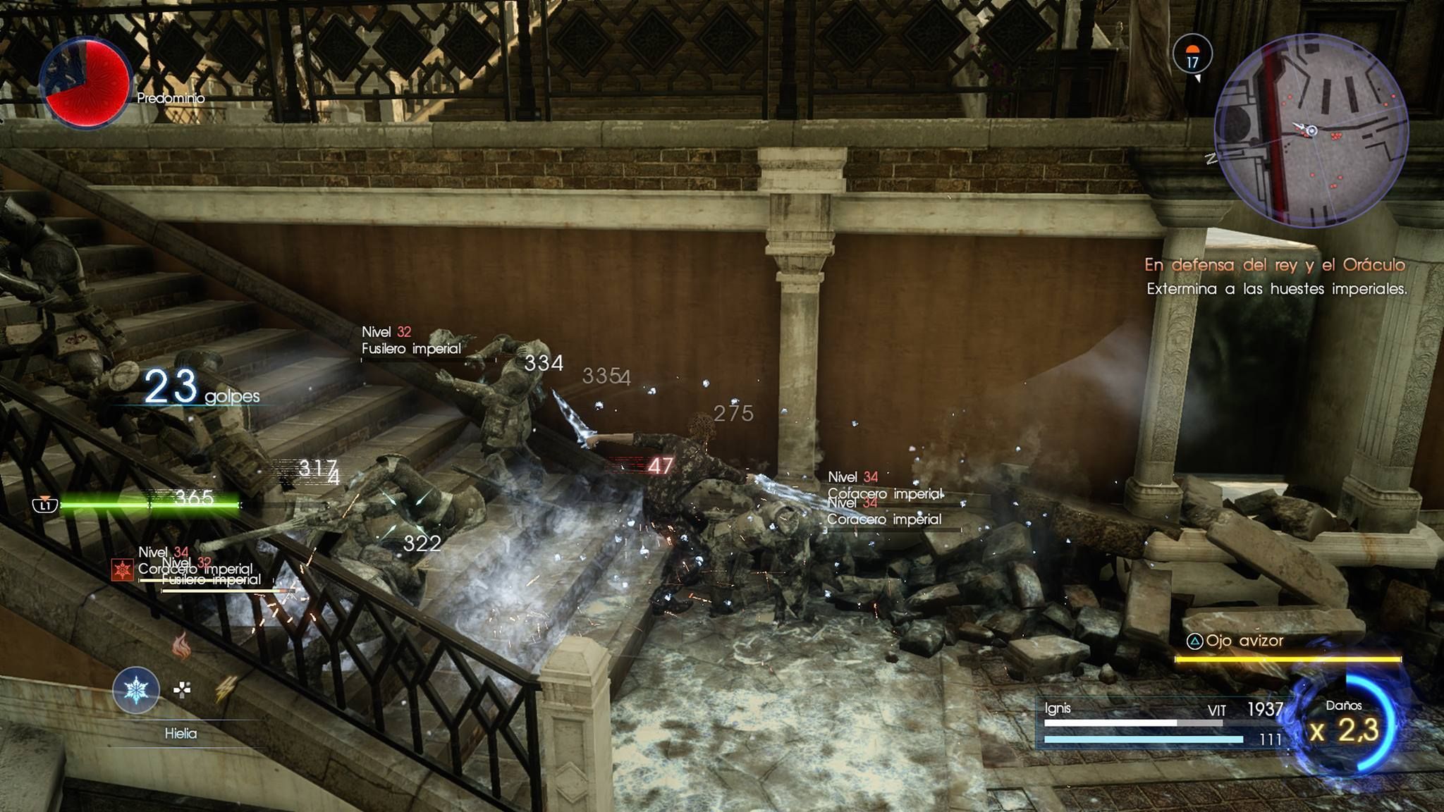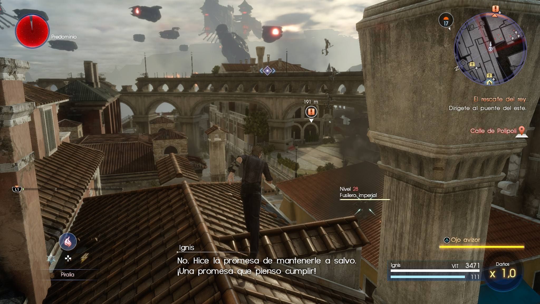 Durante la primera parte del recorrido consiste básicamente en ir hacia la posición de Noctis limpiando las calles, y conseguiremos un garfio que nos eleva al tejado de las casas. No está excesivamente aprovechado dada la brevedad del contenido descargable, pero ayuda a la movilidad del personaje. Cuánto habría mejorado la historia de Final Fantasy XV si Episode Ignis estuviese integrado en ella desde un principio y pudiéramos explorar la ciudad con más libertad.