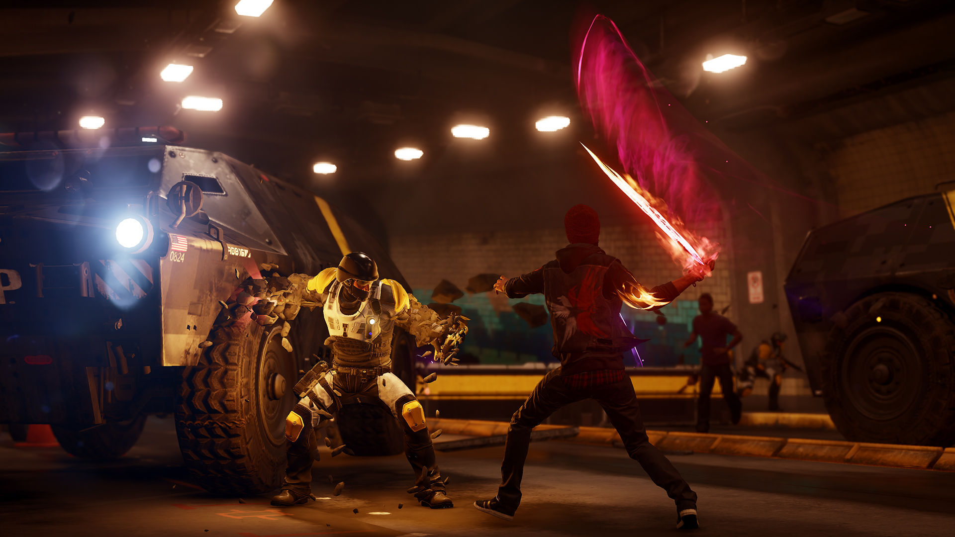 Las novedades vienen por parte de los nuevos poderes de Delsin, de los que de momento solo se han desvelado dos: neón y humo. Si absorbemos luz de neón, y la ciudad está llena de estos por lo que no es un problema, golpeamos con una especie de espada de luz, podemos correr por las paredes de los edificios, lanzar proyectiles y una granada que deja a los enemigos suspendidos en el aire, y al apuntar se desvela y se marca en rojo la debilidad de nuestros rivales, que en la mayoría de los casos es la cabeza.
