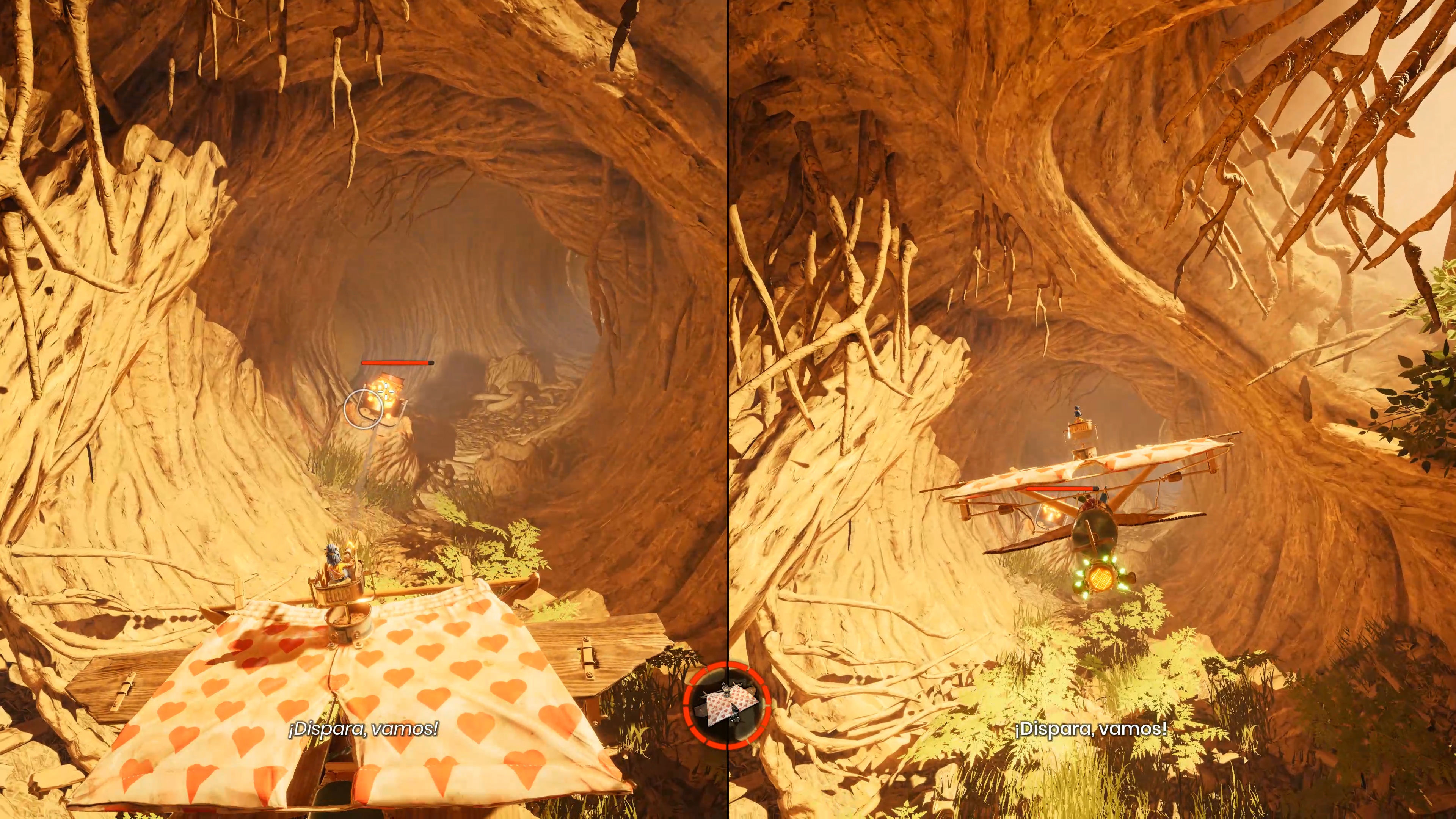 Pero además, que solo se pueda jugar en cooperativo es lo que hacen únicas a todas esas mecánicas. En apenas tres horas hemos pasado por secciones de plataformas en las que nos teníamos que sincronizar con nuestro compañero para que fuera activando mecanismos y pudiéramos pasar de una plataforma a la siguiente; nos hemos metido por tuberías en las que uno de nosotros tenía que mover el tubo para que nos lanzase al lugar deseado; hemos pasado por secciones en las que uno podía disparar clavos que creaban agarres al otro, que llevaba una cabeza de martillo con la que se podía balancear; combatimos contra ejércitos de abejas que solo se podían vencer con uno disparando savia y otro lanzando proyectiles a la savia para que explotara; ha habido momentos en los que estábamos muy separados en niveles enormes, cada uno accionando mecanismos que permitían avanzar al otro...