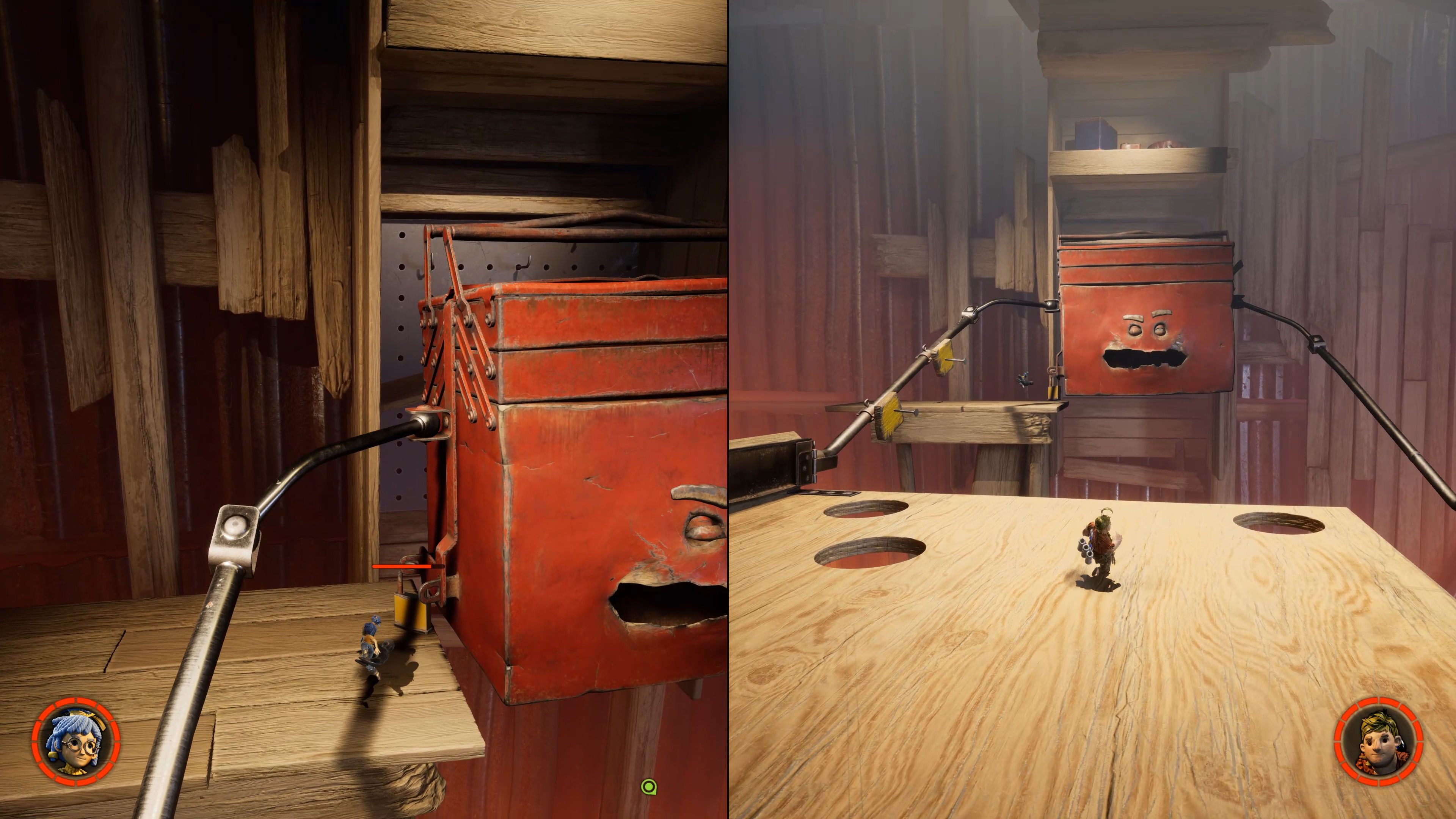 Por citar un par de ejemplos: un decorado en el que hacernos fotos con una cámara gigantesca para después colgarlas en la pared y una descacharrante máquina en la que podemos electrocutar, explotar y matar de mil maneras a nuestro compañero. Son secciones que ayudan a asentar el ritmo de la aventura y que aportan aún más variedad a un juego en el que no habrá ni coleccionables ni motivos por los que rejugar más allá de disfrutar el título desde la perspectiva del otro personaje. El motivo, con el que estamos bastante de acuerdo, nos lo explicó así Fares: "¿Quien sigue rejugando juegos si las estadísticas muestran que la gente ni se acaba los juegos?"