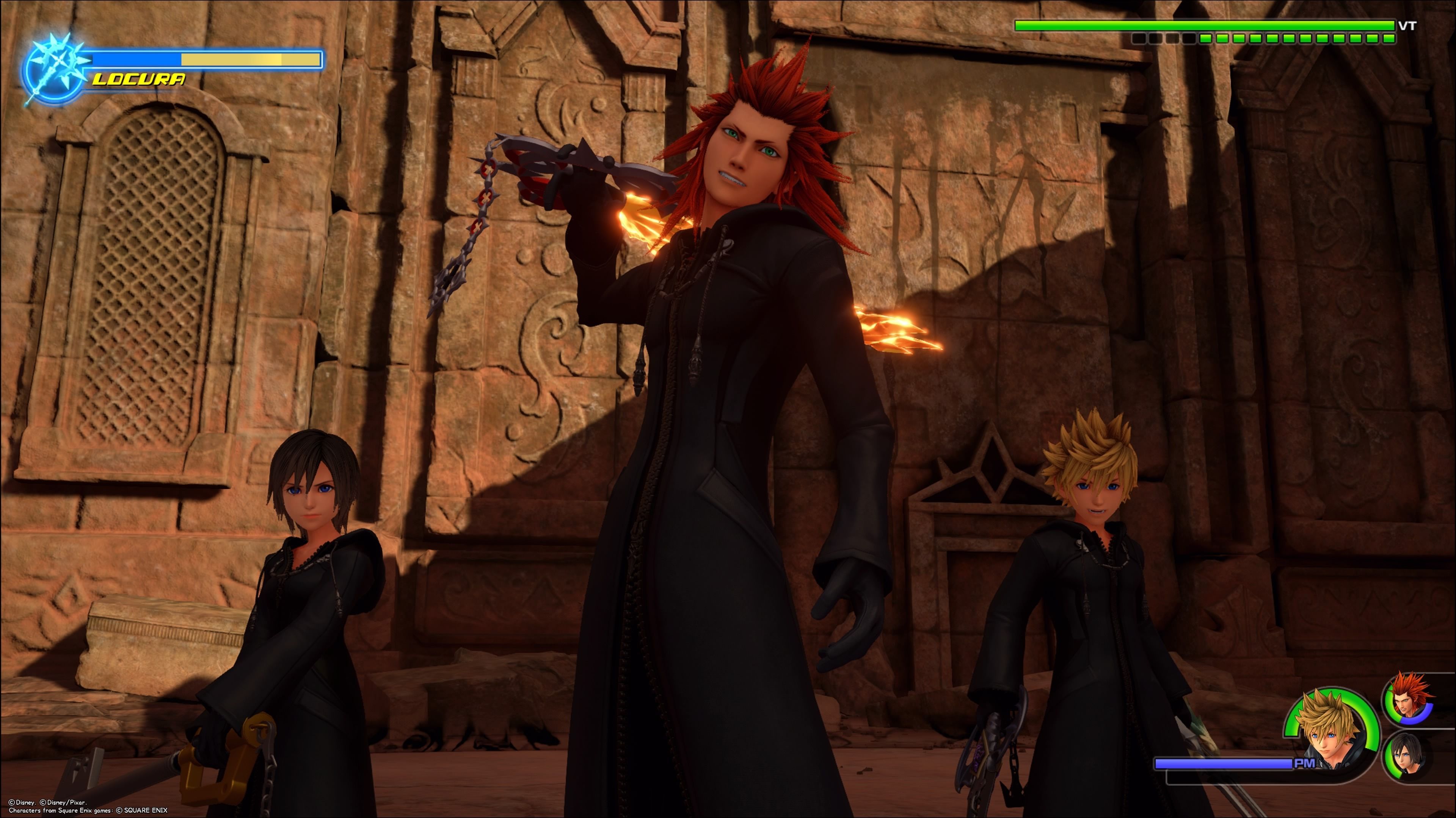 La mala noticia es que toda esta premisa trae consigo algunos problemas. El primero y el más evidente es que en lo jugable la gran mayoría sus contenidos son reciclados, especialmente en sus dos primeros tercios. Esto significa que nos volveremos a enfrentar a los mismos jefes que ya vencimos y a ver los mismos vídeos, aunque con algunas escenas añadidas que nos dan un nuevo contexto, lo que a efectos prácticos resulta muy decepcionante. De hecho, para intentar paliar esta sensación de reiteración ahora hay algunos combates clave en el que nos darán la opción de jugarlos controlando a otro personaje, como Aqua, Riku o Roxas. Controlarlos es opcional, aunque os recomendamos hacerlo para equilibrar la dificultad, ya que si vuestro Sora es demasiado poderoso no os durarán ni medio segundo los jefes, mientras que estos héroes alternativos tienen un nivel acorde al del combate en el que son jugables, sintiéndose como una especie de mezcla entre un parche y el puro fanservice.