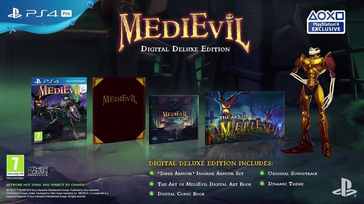 La segunda edición es la Digital Deluxe, con un precio de 39,99 €. Esta versión incluye el remake y varios extras descargables: el libro de diseños The Art of Medievil, la banda sonora, un tema dinámico para PS4 y un cómic digital.