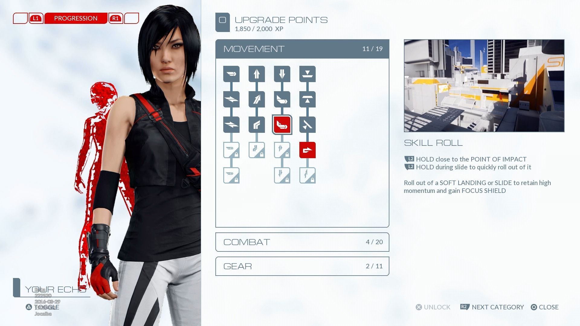 Todos estos objetivos secundarios y coleccionables nos proporcionan puntos de experiencia, que sirven para desbloquear habilidades en el nuevo sistema de progresión. Podemos obtener nuevos movimientos de combate, nuevos gadgets como dispositivos de pirateo o un gancho que todavía no hemos podido probar, o movimientos de parkour que en el juego de 2008 teníamos desde el principio pero que aquí nos tenemos que ganar, como el rodar al caer al suelo o girar 180 grados al apoyarnos en una pared. Esto ha sido un tanto criticado por los fans del original, pero a nosotros no nos parece mal, ya que así vas asimilando las claves de la jugabilidad con los movimientos básicos, y poco a poco la cosa se va haciendo más compleja y profunda, con tiempo de sobra para ir acostumbrándote.