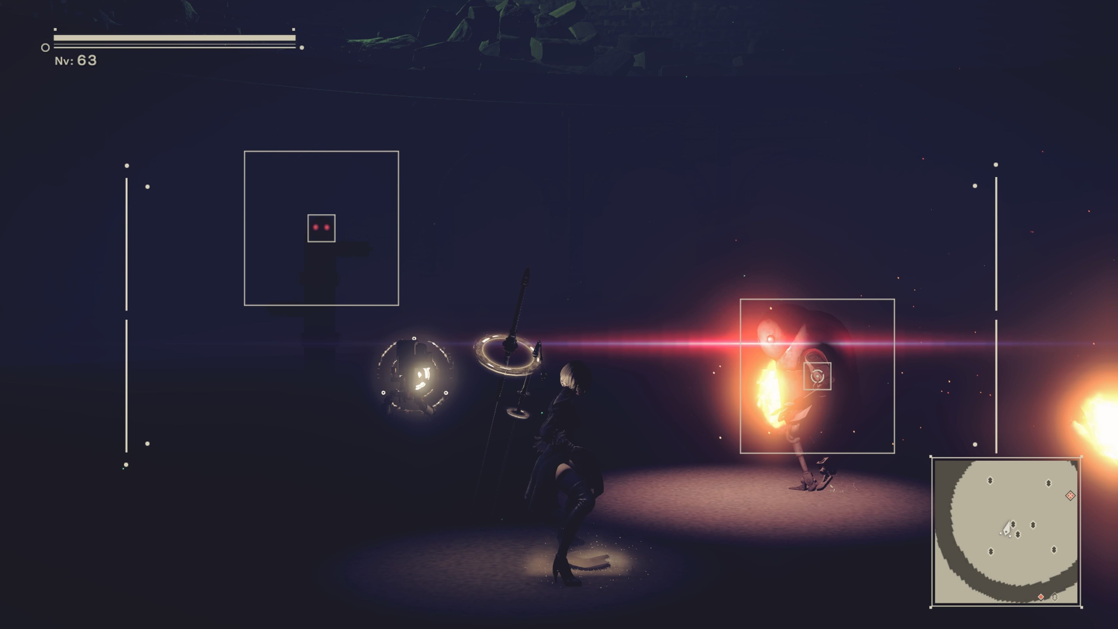 La segunda arena es bastante más especial, ya que aquí no combatiremos con ninguno de nuestros tres protagonistas, sino con algunas de las máquinas que podemos controlar a lo largo de la aventura pirateando con 9S. Sus atributos y estadísticas escalan con nuestro nivel, y al tener una movilidad tan reducida y un repertorio de movimientos tan limitado conviene ir bastante entrenado para que no nos hagan chatarra en los rangos intermedios y superiores. Nos ha parecido una zona de combate muy original y diferente a lo que el resto del juego nos había acostumbrado, por lo que hemos disfrutado (y sufrido) superándola, aunque batallar de este modo no es tan satisfactorio como cuando controlamos a 2B, 9S o A2, por lo que no resulta tan divertida como las otras dos arenas.
