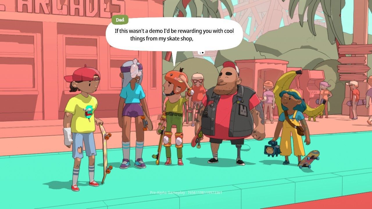 El mundo de OlliOlli World está vivo, lleno de personas y personajes de lo más peculiares: tan pronto vemos a un cono de helado antropomórfico como a una gaviota musculada o a un árbol gigante con piernas y brazos. La mayoría de ellos simplemente pululan por los escenarios sin ofrecer demasiada interacción, pero otros actúan como NPC con los que podemos hablar para obtener misiones secundarias en nuevos escenarios en las que podremos desbloquear equipo como atuendos o nuevas tablas, algo que en la demo, eso sí, todavía no estaba disponible.