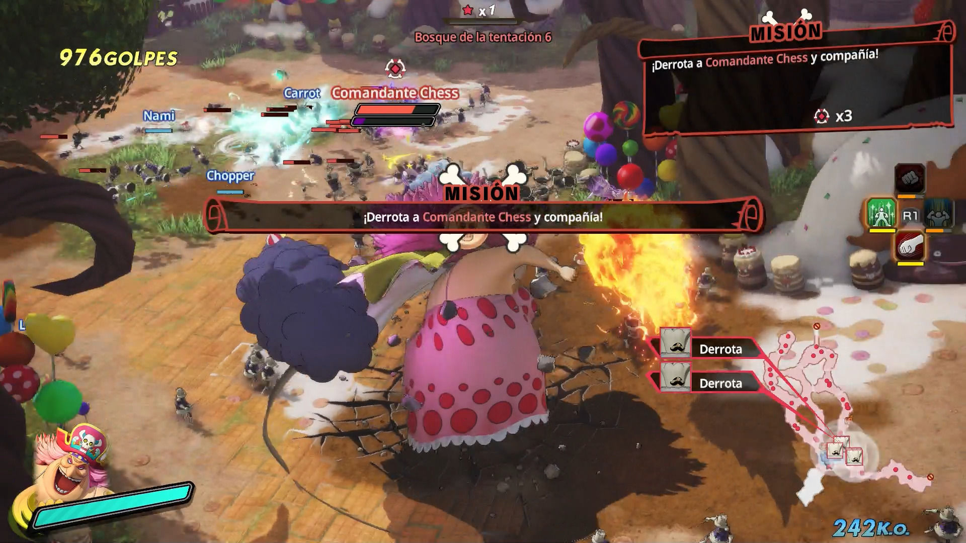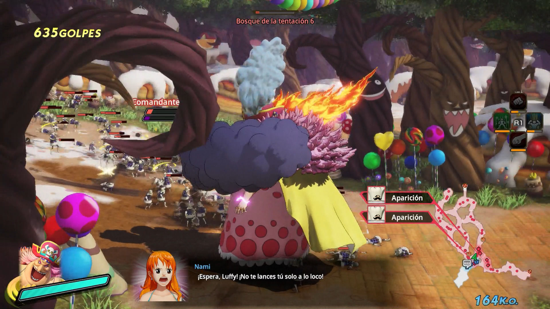 Apoyado en una narrativa que, en esta ocasión, repasará los momentos más famosos y épicos sucedidos en la obra manganime original, tendremos que ir avanzando por escenarios plagados hasta los topes de rivales a los que tendremos que ir destrozando a base de golpes y más golpes. Y para ello será posible controlar a una cantidad ingente de protagonistas, más de 40 para ser más precisos, siendo algunos de ellos y como ya sospecharéis totalmente inéditos dentro de esta saga. Y ojo, que tipos gigantes como la "adorable" y brutal Big Mom o el fantástico Katakuri, personaje al que hemos podido controlar durante unos minutos y que nos ha encantado, harán acto de aparición por vez primera en esta serie.