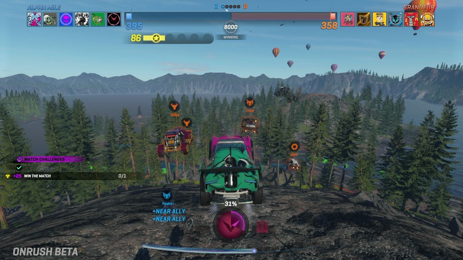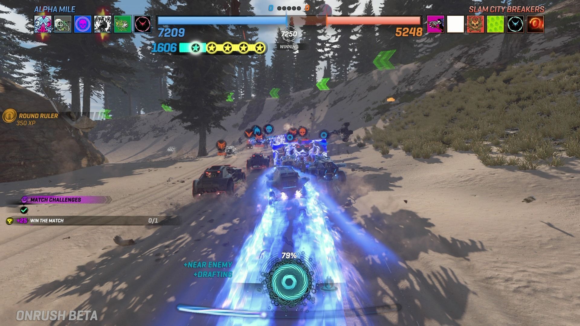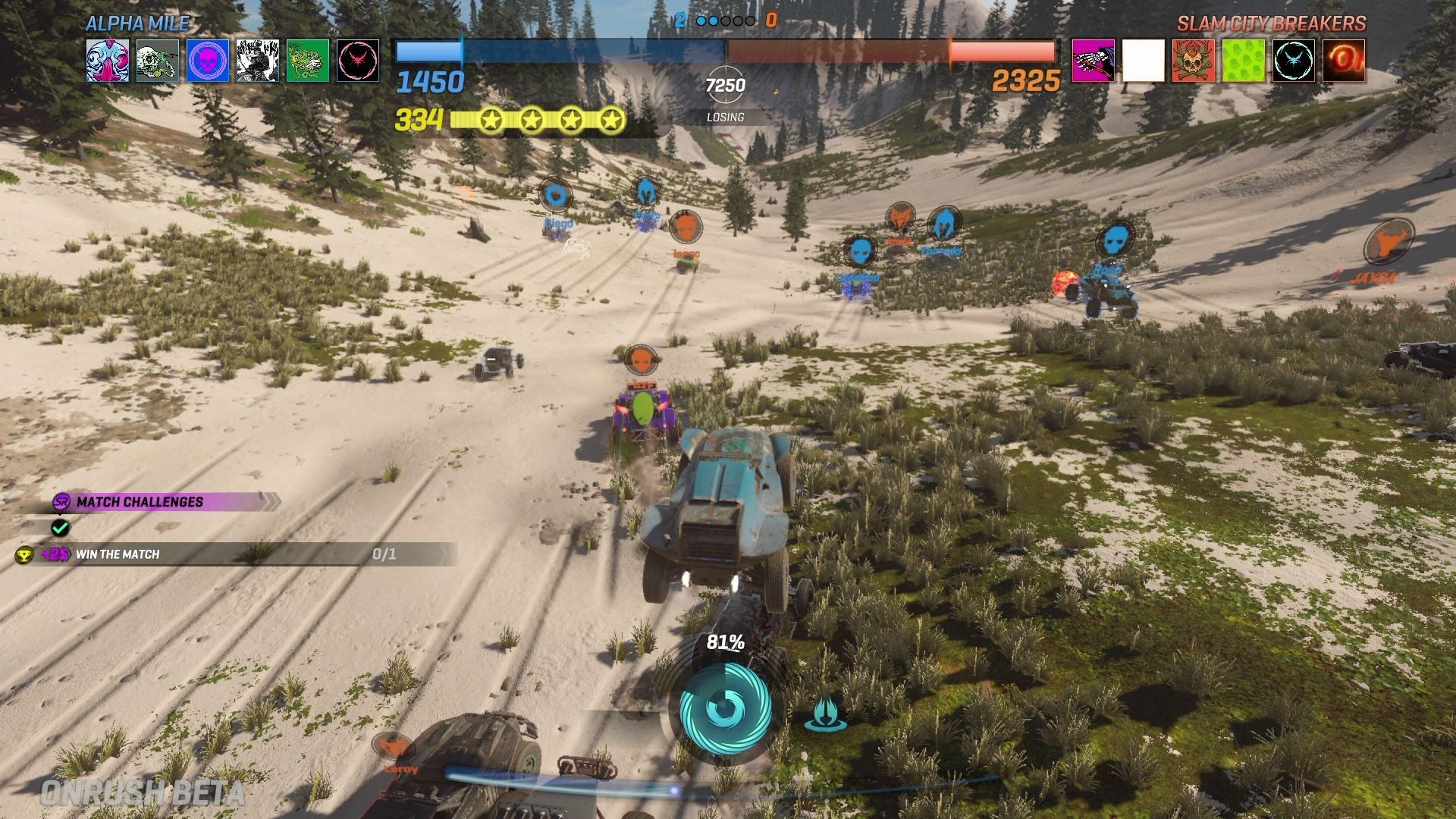 En las partidas de Onrush siempre compiten dos equipos de seis conductores cada uno, aunque realmente siempre hay 24 vehículos corriendo a toda velocidad por los escenarios, ya que hay doce minions, que cumplen un papel similar a los de Titanfall, el de ser pura carnaza que destruir y así aumentar la barra de turbo.