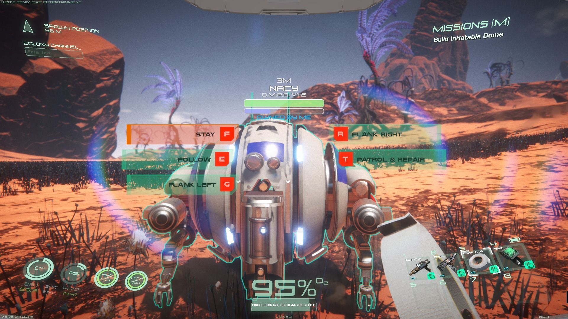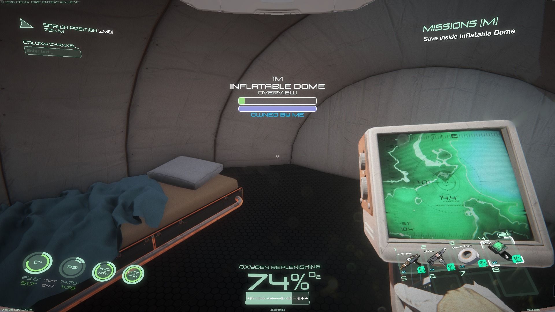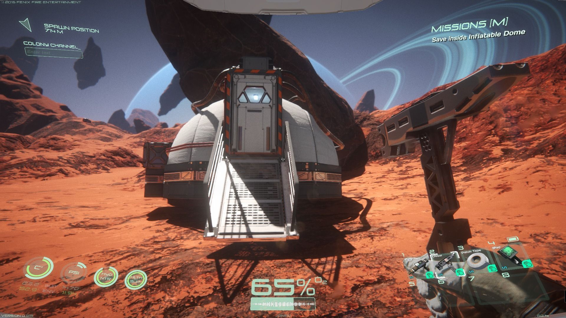 Pero, para que nuestro personaje se pueda desenvolver bien en este mundo hostil donde hasta la flora puede matarle, siempre que iniciemos una nueva partida tendremos a nuestra disposición un Kit de Supervivencia dotado con botiquines y elementos de curación, un Kit de Munición, con una pistola y un fusil de asalto, y finalmente, una Cúpula Hinchable. De la misma forma, independientemente de que hayamos muerto y perdido todo el equipo que portábamos, cuando resucitemos en la base siempre tendremos un cincel para extraer materiales, cinta americana para sellar las posibles grietas del casco en caso de ataques, un mapa interactivo, y una multiherramienta orientada a la construcción. Todo ello se guardará en nuestro inventario, compuesto por una serie limitada de espacios de almacenaje y con una restricción de peso