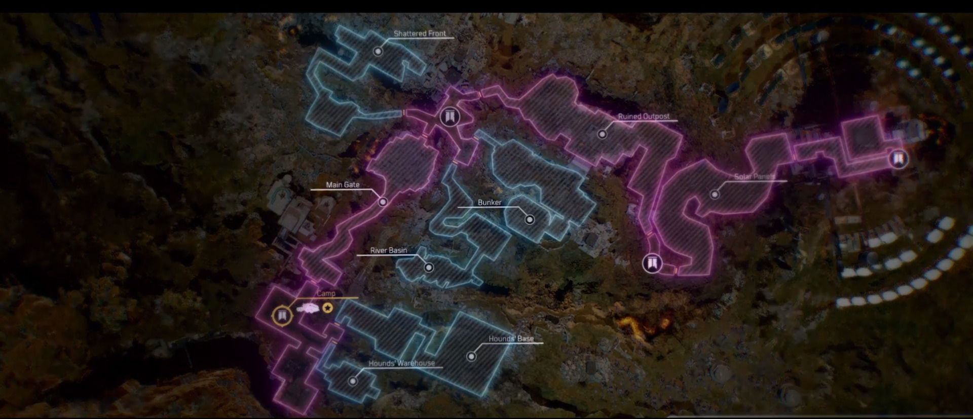 Outriders plantea sus zonas como un plano donde el camino principal de la historia tiene bifurcaciones donde te puedes perder para explorar, cumplir misiones secundarias y otros retos. El punto de partida siempre será la base o el hub. Esos lugares son campamentos, microsociedades donde hay tenderos a los que comprar armas, bares donde conseguir encargos y personajes que nos ofrecen misiones secundarias. Mientras vamos cumpliendo misiones, los campamentos irán cambiando, recibiendo a nuevos personajes y más misiones secundarias.