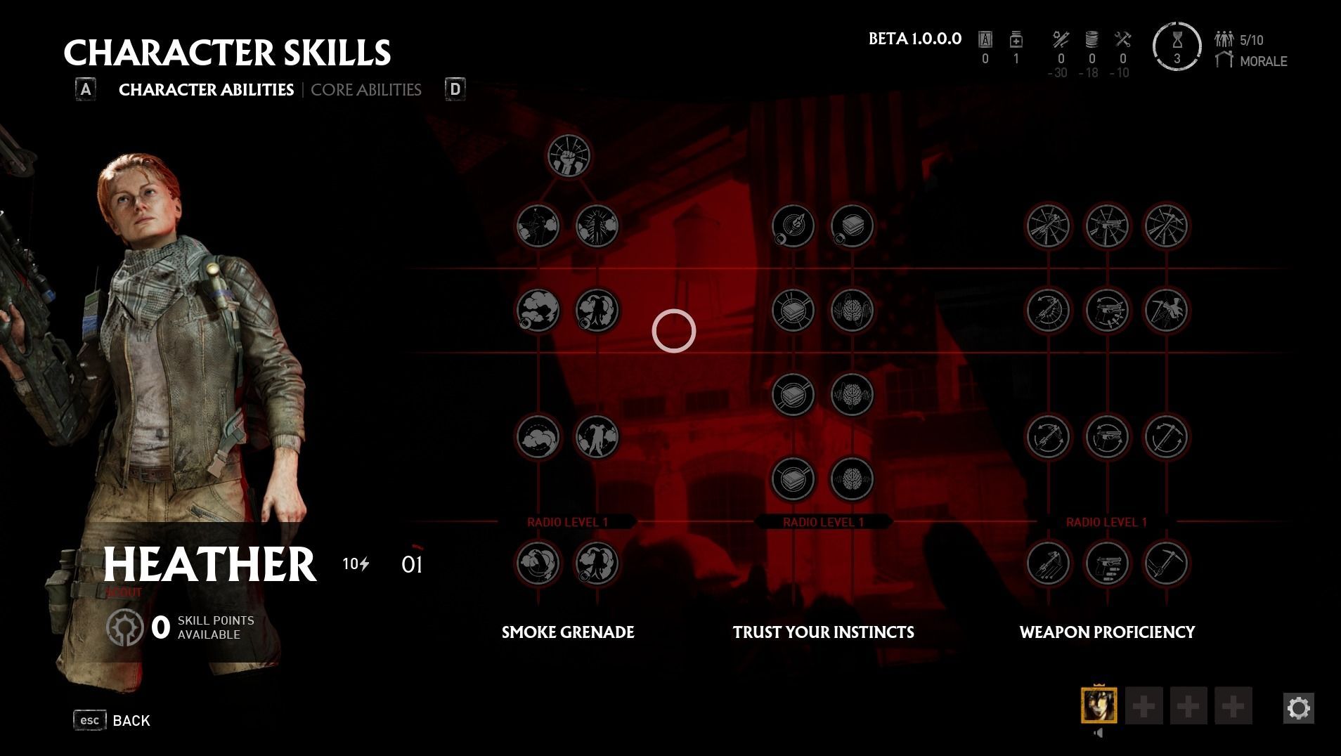 Cada uno de estos personajes tiene un árbol de desarrollo específico compuesto por tres ramas de progresión distintas, consiguiendo con ello una mayor especialización. Además, todos ellos comparten un árbol de evolución común en aspectos como: armas, salud, estamina o crafting. También contamos con un variado arsenal de armas de fuego y melee compuesto por rifles de asalto, ballestas, bates o, por ejemplo, machetes. Además, gracias a la recolección de materiales podremos personalizar tanto la apariencia visual como el rendimiento de las armas, mejorándose apartados como alcance o velocidad de recarga. De igual forma, también es posible desbloquear nuevas apariencias para nuestros personajes.