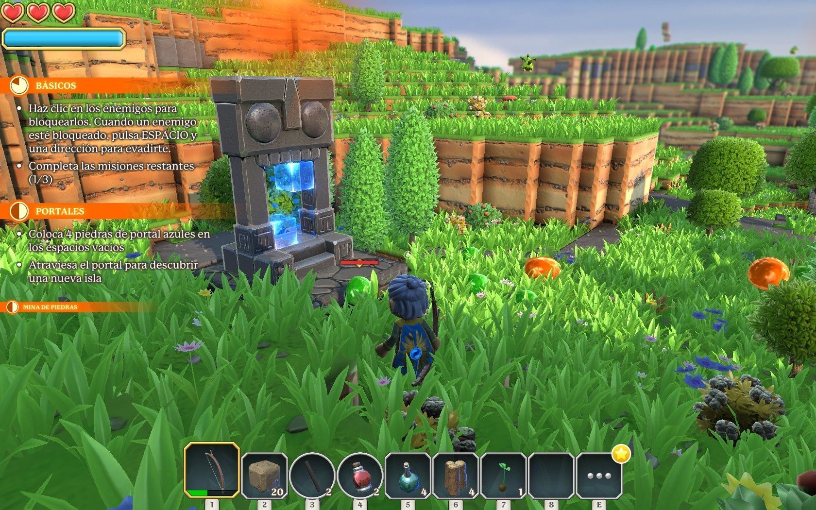 La primera isla incluye un pequeño tutorial para familiarizarse con el juego; el control es bastante sencillo (básicamente, mueves al personaje, atacas y esquivas), y se puede jugar en primera o tercera persona, y cambiar entre ambas en cualquier momento. El mando de PS4 se adapta sin problemas y en PC la opción más cómoda es utilizar las teclas WASD . Pero puede ser algo complicado entender el manejo de materiales y objetos porque, tras crearlos, debes pasarlos a la mochila y, de ahí, al menú rápido si lo deseas. También hay que decir que esa complejidad es mayor en la versión de consolas que en PC.