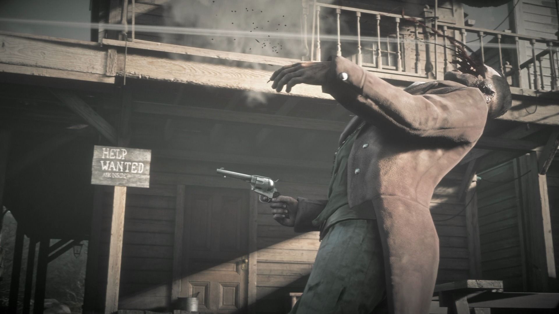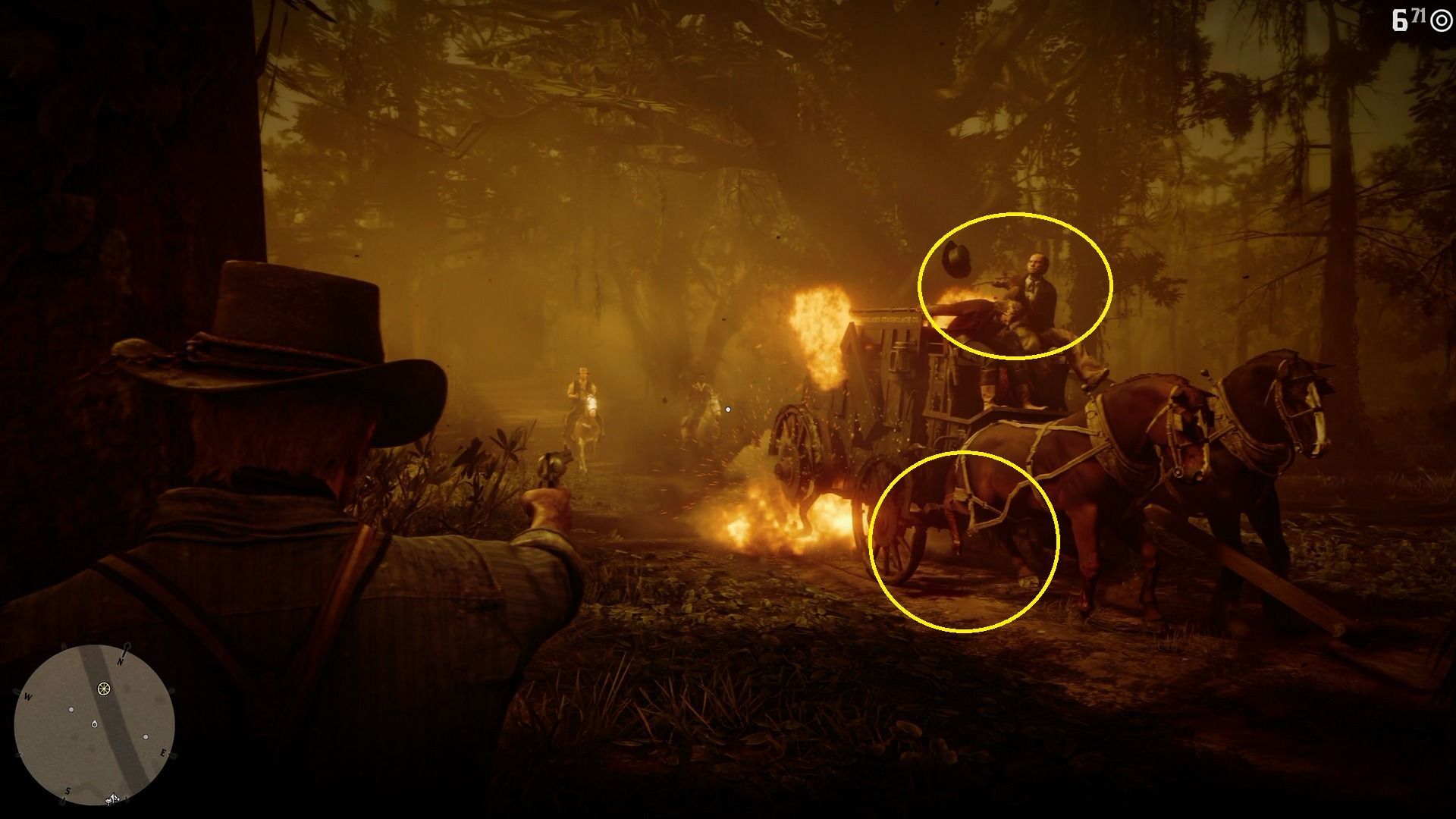 Cuando nos están explicando el uso del Dead Eye, disparan a un carro a cámara lenta, este explota y se ve cómo la explosión arranca un brazo a un personaje y una pata a un caballo.