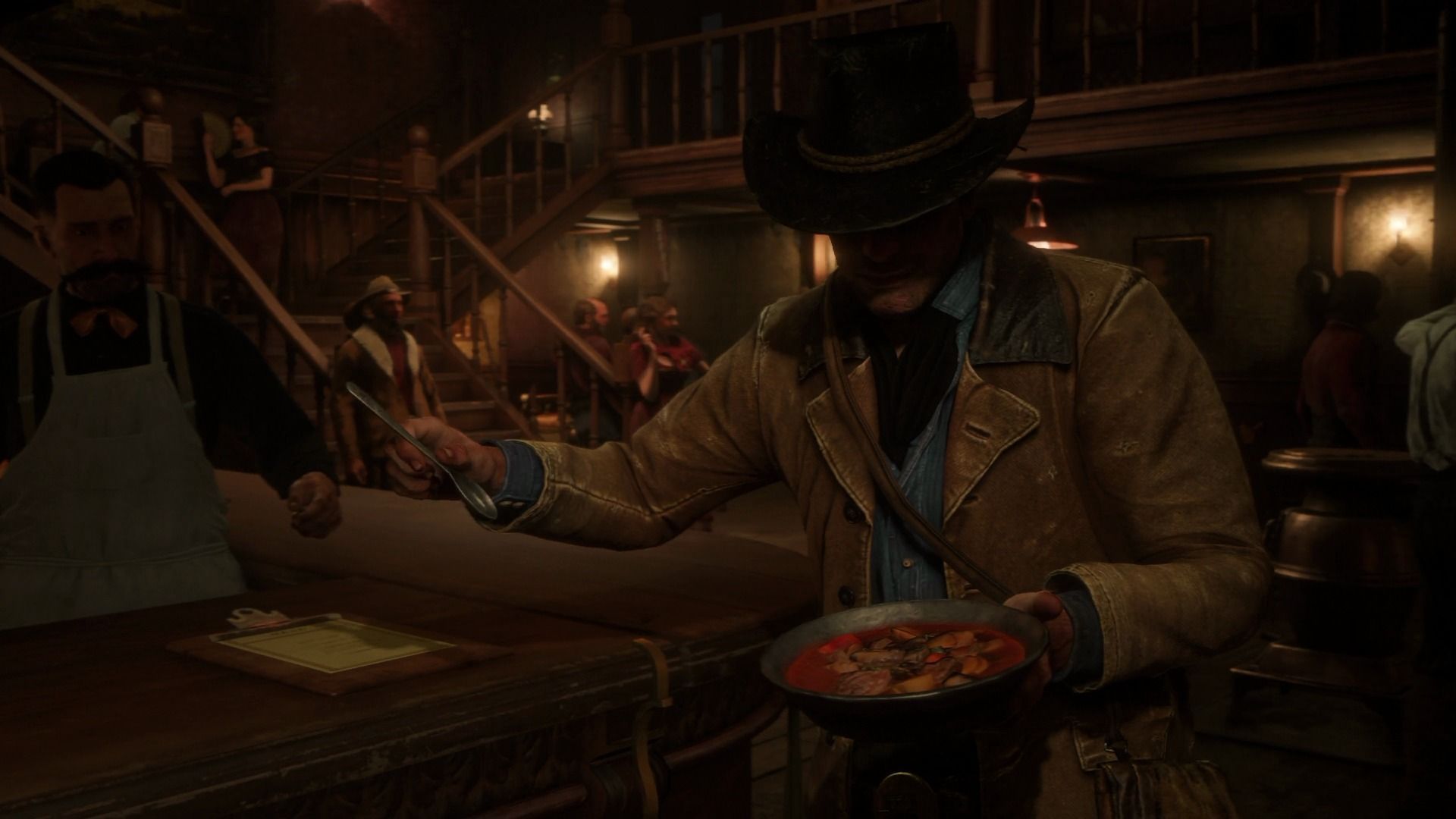 A lo largo de la aventura tendremos que alimentarnos para que Arthur Morgan no desfallezca, ya que si no descansamos de vez en cuando y no nos alimentamos la barra de salud y de resistencia, que sirve para correr, se verán mermadas. Eso sí, habrá que tener cuidado con lo que comemos, ya que Arthur podrá engordar y adelgazar a lo largo del juego; si engorda demasiado se cansará más rápido al esprintar.
