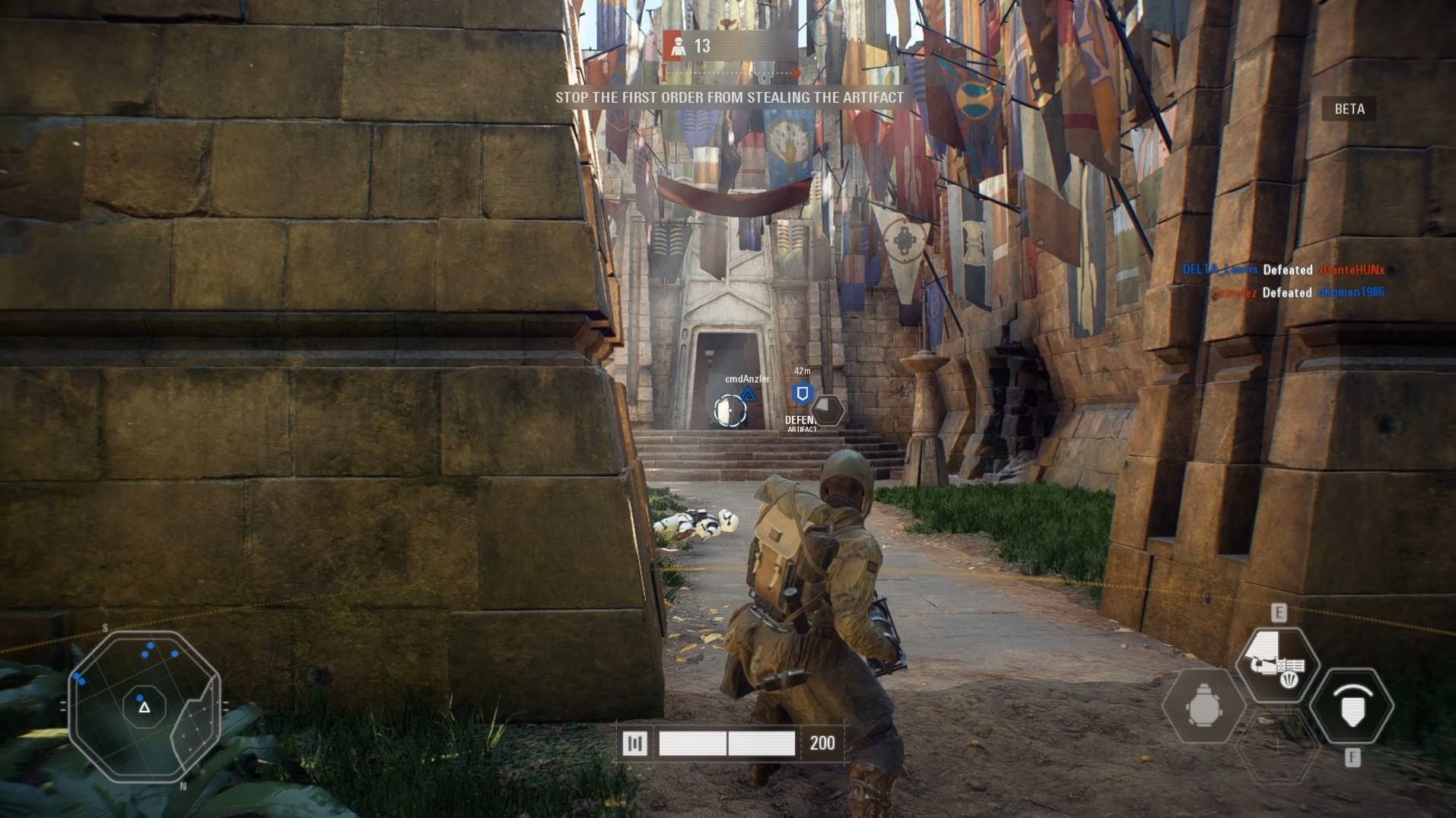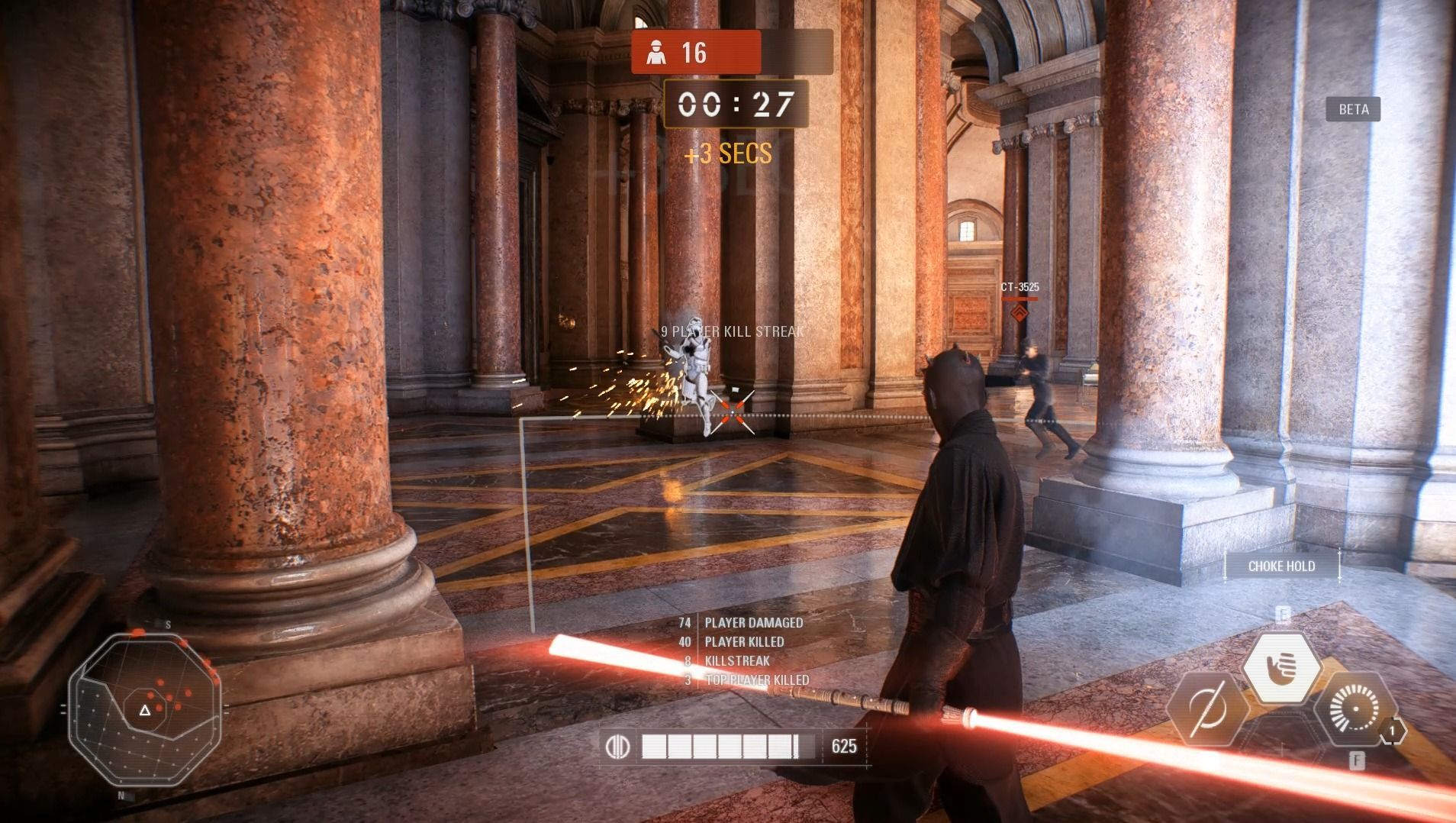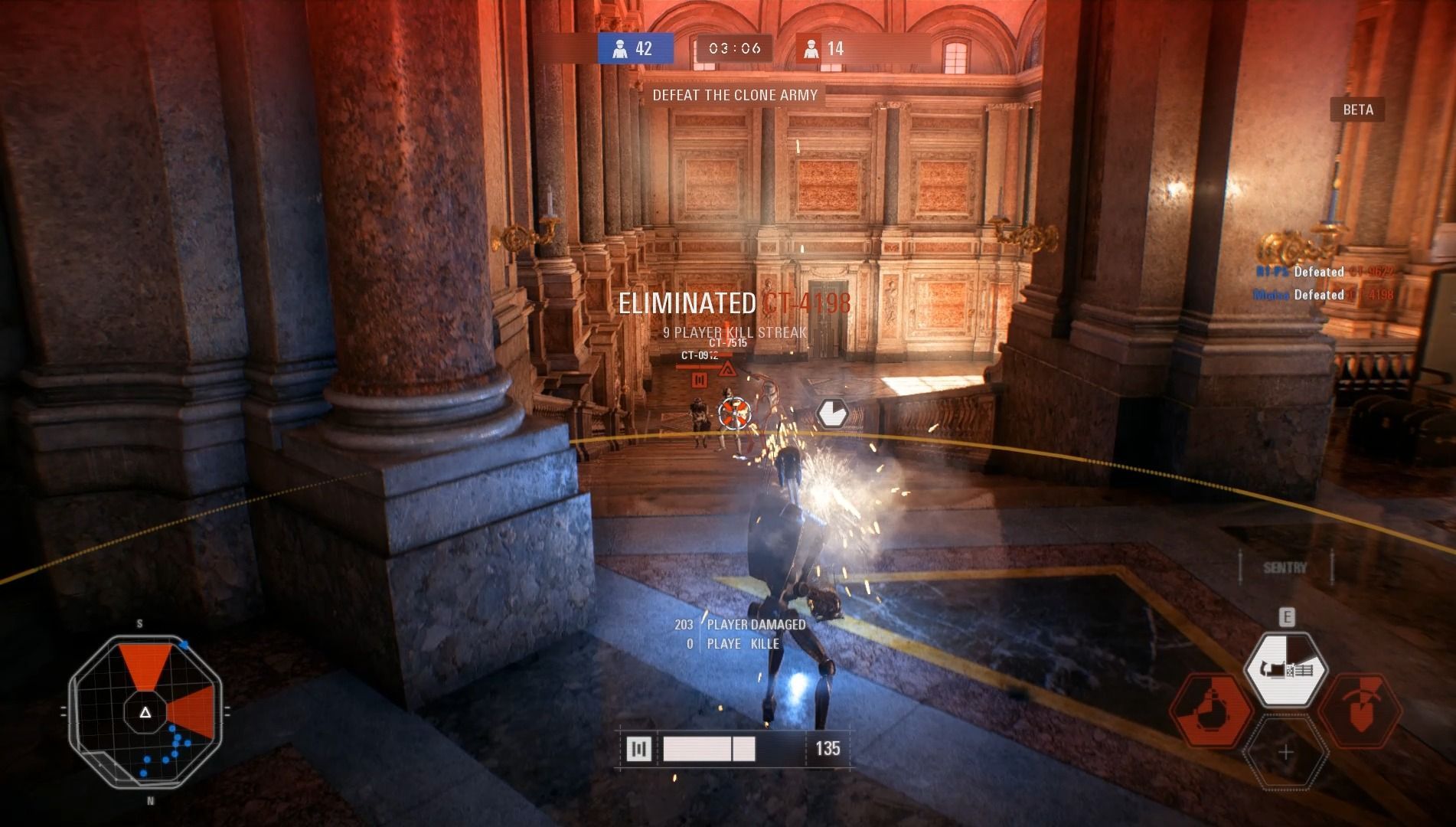 El modo más espectacular de la beta es Asalto Galáctico; aquí lucharán dos equipos de 20 jugadores en entornos realmente amplios y con una buena variedad de objetivos que le aportan un toque más narrativo a la propuesta. En esta ocasión hemos podido jugar en Naboo, un combate armado que ya se pudo ver durante el E3 y que es realmente asombroso. Dependiendo del bando para el que luchemos nuestro objetivo será detener al ejército invasor o intentar tomar el palacio.