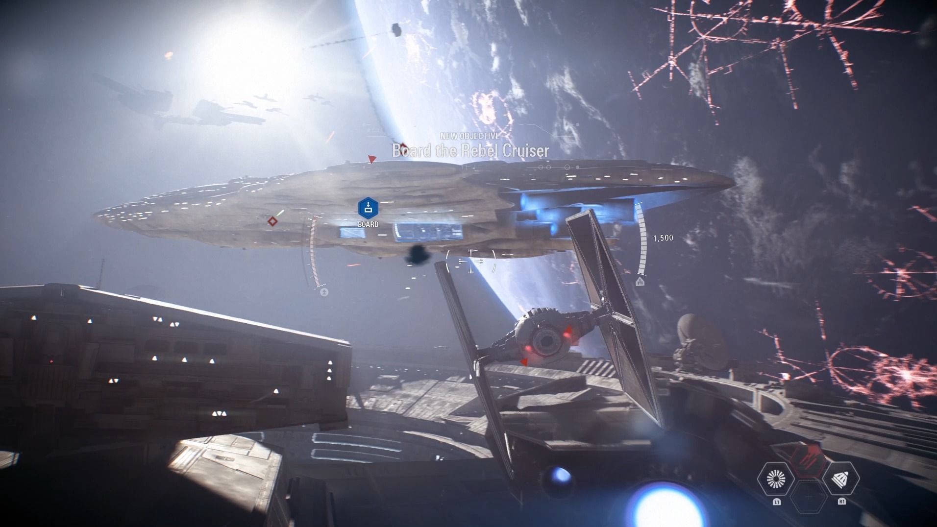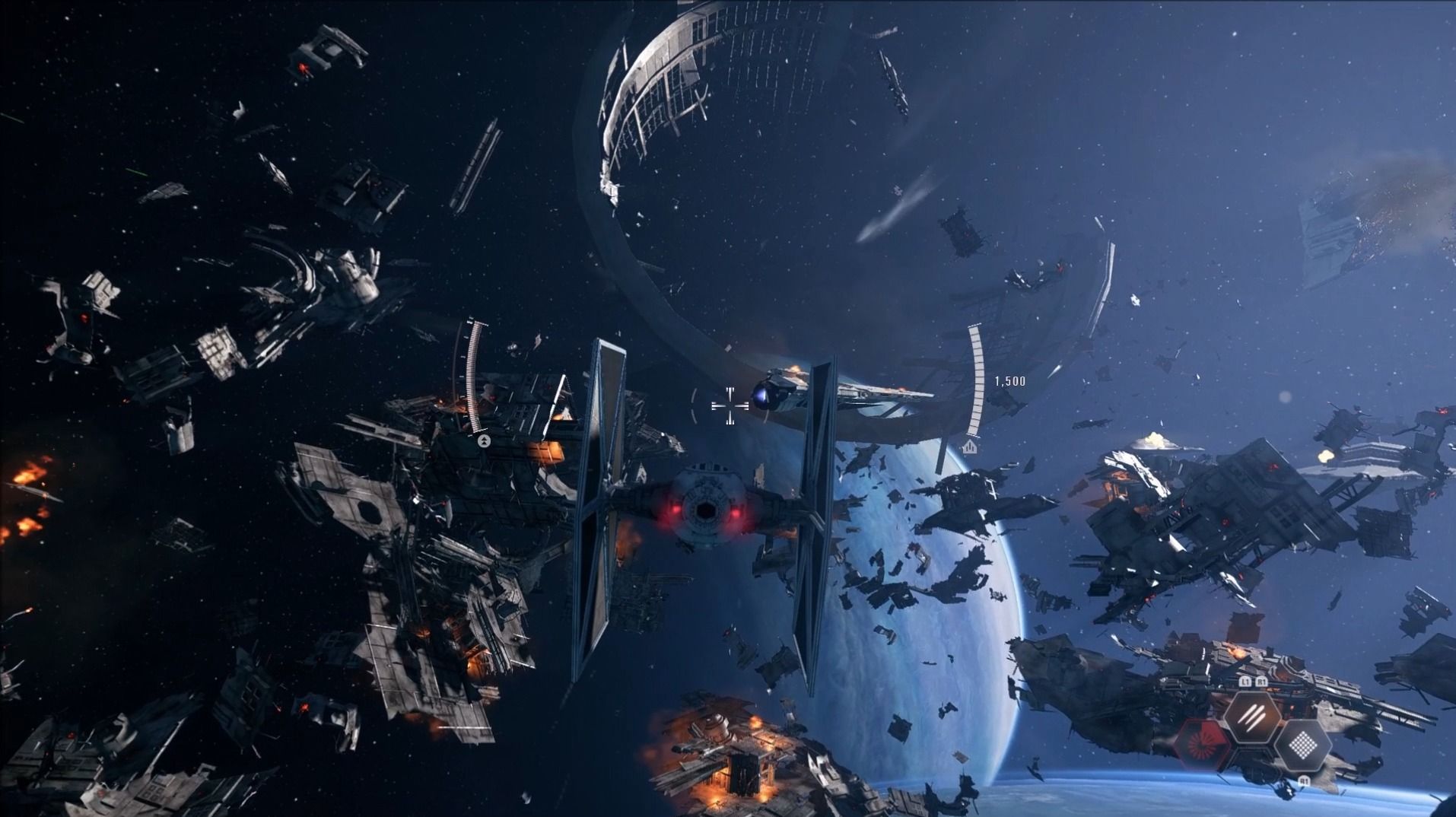 Tras escapar de Endor será momento de disfrutar de una espectacular fase aérea en la que pilotaremos un T-Fighter entre los restos de la Estrella de la Muerte. Este impresionante paraje galáctico será el escenario de las primeras batallas aéreas contra los rebeldes, ofreciendo en términos jugables una experiencia idéntica a lo que hemos podido disfrutar durante la beta multijugador.