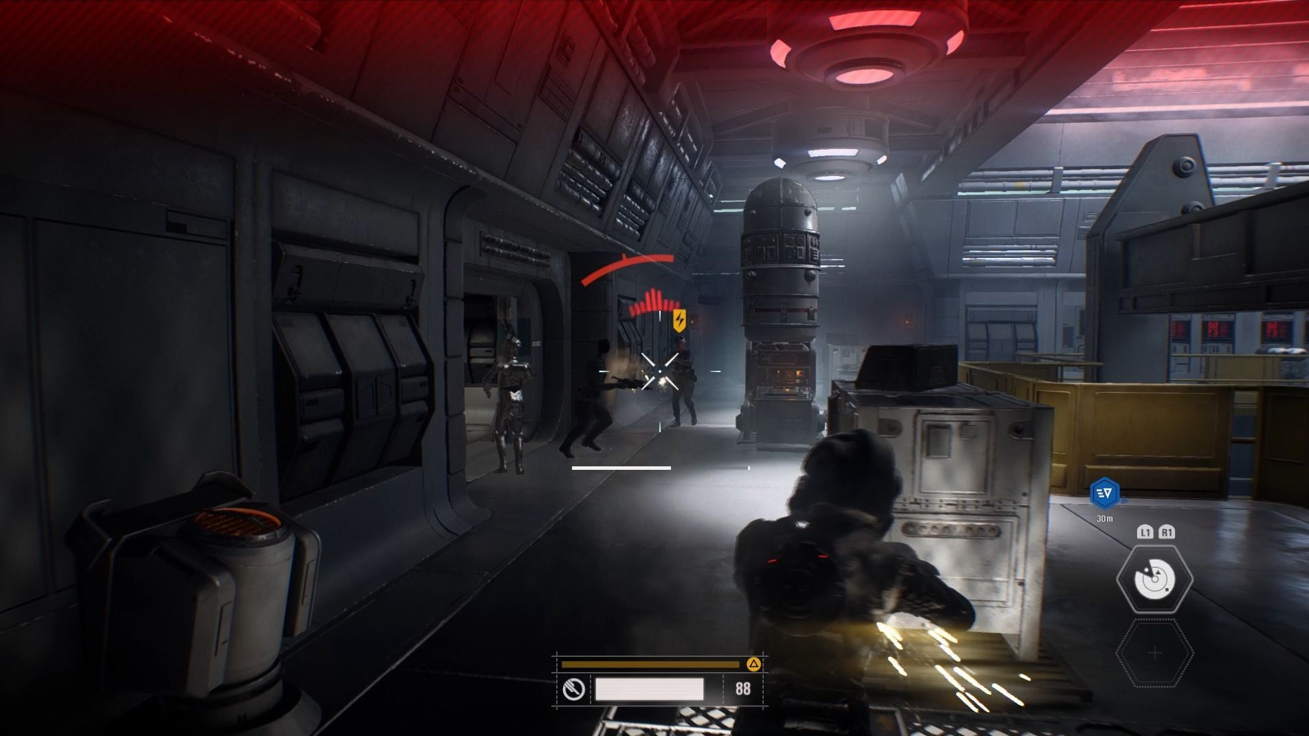 En total hemos podido jugar los tres primeros capítulos de la campaña y en todo momento hemos encarnado el papel de Iden Versio, una oficial del ejército imperial que ha sido capturada por los rebeldes. Nuestro primer objetivo será escapar de la nave enemiga, y para ello contaremos con un dron de reconocimiento que manejaremos a distancia. Esta primera fase estará inicialmente orientada al sigilo y, aunque pueda resultar un poco pausada para empezar una historia de estas características, lo cierto que es un buen tutorial y rápidamente comenzará la acción.