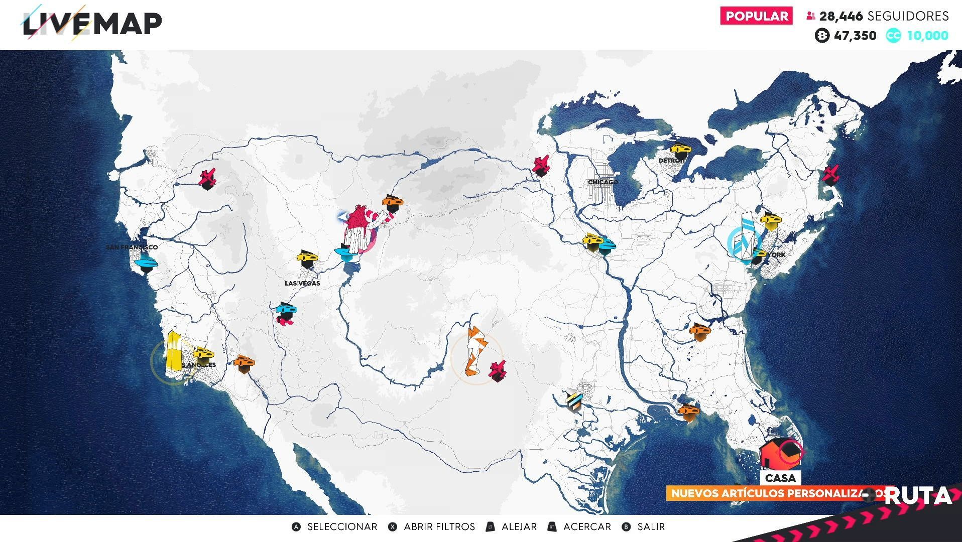 Nuevamente disponemos de un extenso mundo abierto que estará completamente desbloqueado y que nos llevará horas recorrer. Esta gigantesca extensión de tierra, mar y aire se podrá visitar libremente según nuestras preferencias, siendo también posible utilizar el viaje rápido para iniciar una competición o unirnos a nuestros amigos. La recreación de Estados Unidos cuenta con una gran variedad de ecosistemas como desiertos, playas, montañas o conocidas ciudades como Nueva York, Los Ángeles, Las Vegas o Detroit. Sin duda, aunque ya la primera parte destacaba en este apartado, la evolución ha sido notable porque, no solo disfrutamos de una enorme variedad de localizaciones repletas de vida, sino que las transiciones entre eventos son ahora más fluidas.