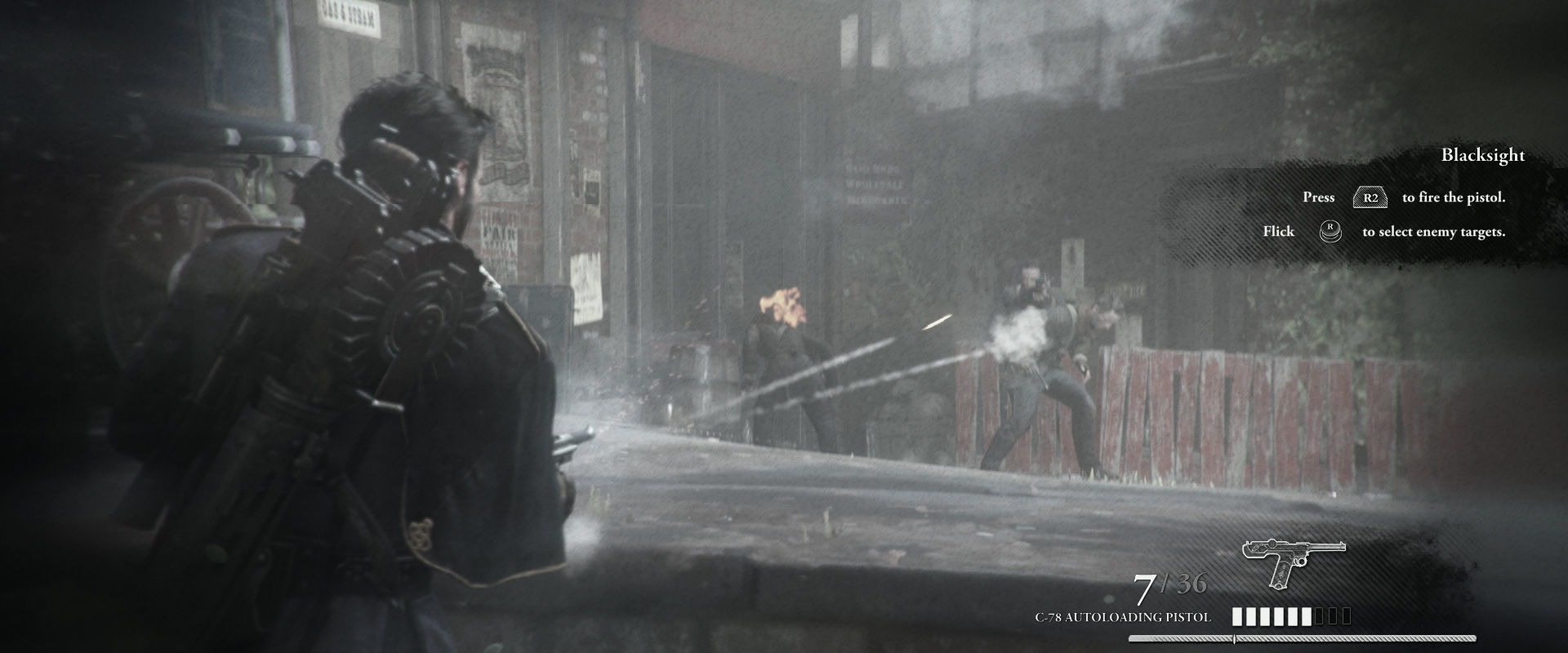 En la segunda parte de acción, en la que queremos dirigirnos al Hospital Real, vivimos un momento inesperado en el juego: la acción se ralentiza y todo transcurre a cámara lenta (elemento ya explorado en otros títulos). En estos instantes nuestro personaje apunta automáticamente y con que apretemos el "gatillo" (el mando) el enemigo cae al suelo directamente (sí, también a cámara lenta). Una herramienta de gran utilidad que activamos presionando L1 cuando nos ataque un número elevado de enemigos al mismo tiempo. Después de unos segundos de subida de adrenalina pura, volveremos al ritmo normal del juego, a sus 30fps. Si activamos esta opción, tenemos la posibilidad de ir alternando con el gatillo al enemigo al que queremos apuntar, ya que habrá alguno que se acerque más rápidamente que otros. Tras este momento, tomamos un monóculo que podemos manejar para ver más de cerca el edificio al que nos estamos dirigiendo. Éste elemento de tecnología en "The Order" ya fue mostrado en la demo del pasado mes de febrero.