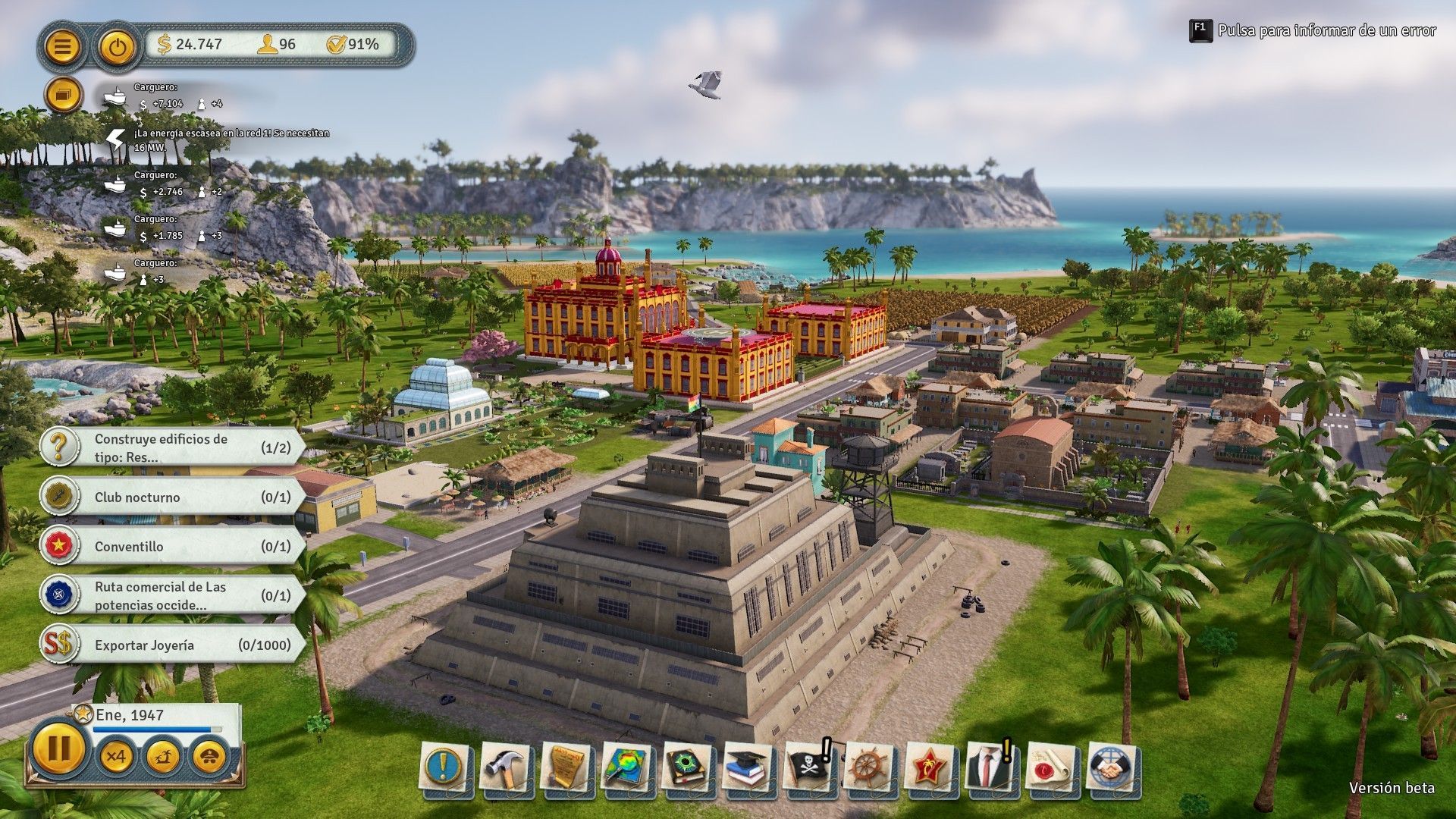 Al empezar una partida lo primero que llama la atención es que ahora hay varias islas para controlar, lo que lleva a pensar cómo vamos a trasladar las materias primeras y los productos manufacturados para no perder demasiado tiempo, y qué edificios son necesarios en cada isla. Tropico ha pasado de transcurrir todo en un mismo espacio a tener hasta 12 islas; ninguno de los cuatro mapas que hemos visto tenía menos de cuatro islas, que se pueden unir entre sí por tierra con un puente, por mar y, suponemos que en las épocas más recientes, aire.