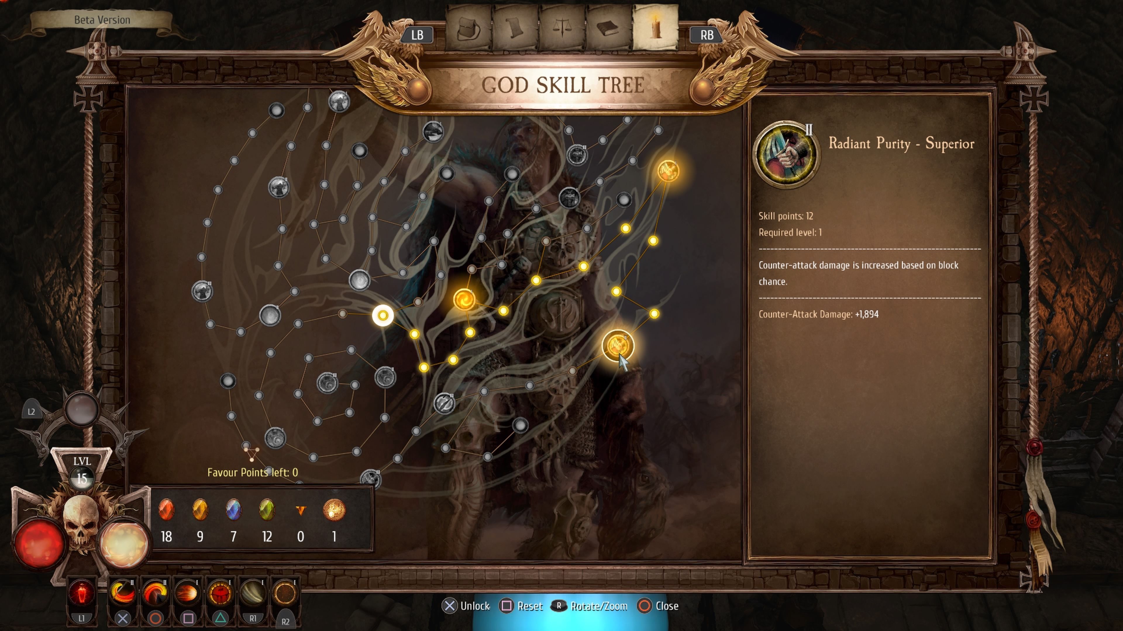 Además de estas habilidades, al alcanzar cierto nivel también podremos acceder a una especie de poderes "divinos", un sistema de habilidades pasivas similar al de Path of Exile mediante el cual deberemos de ir escogiendo si queremos que nuestro personaje sea más resistente, más fuerte o tenga una mayor potencia en sus golpes al contraataque, por poner tres ejemplos.