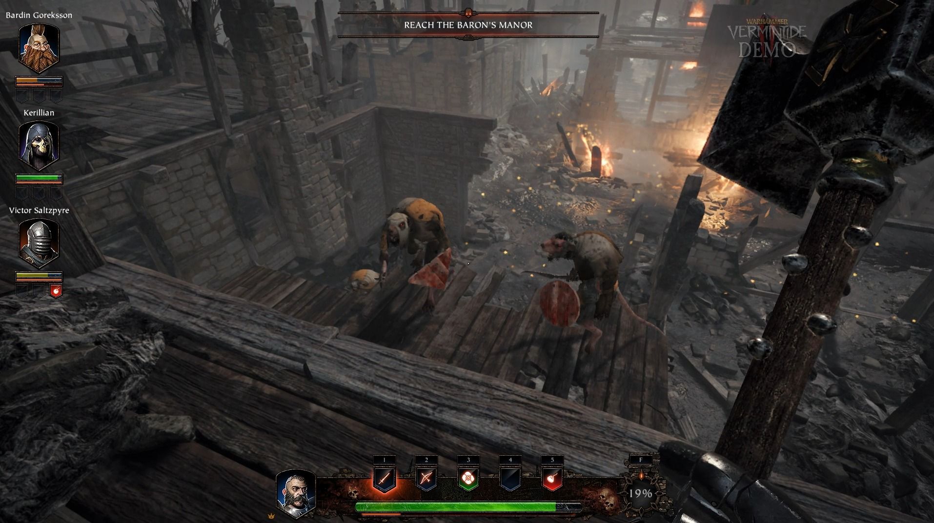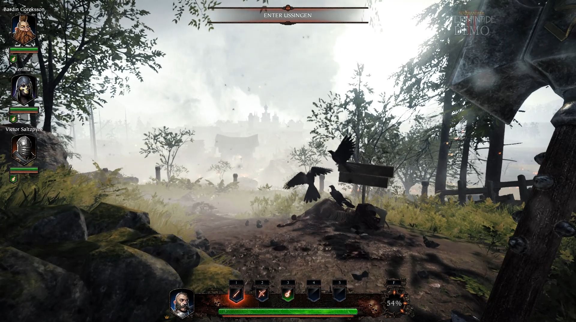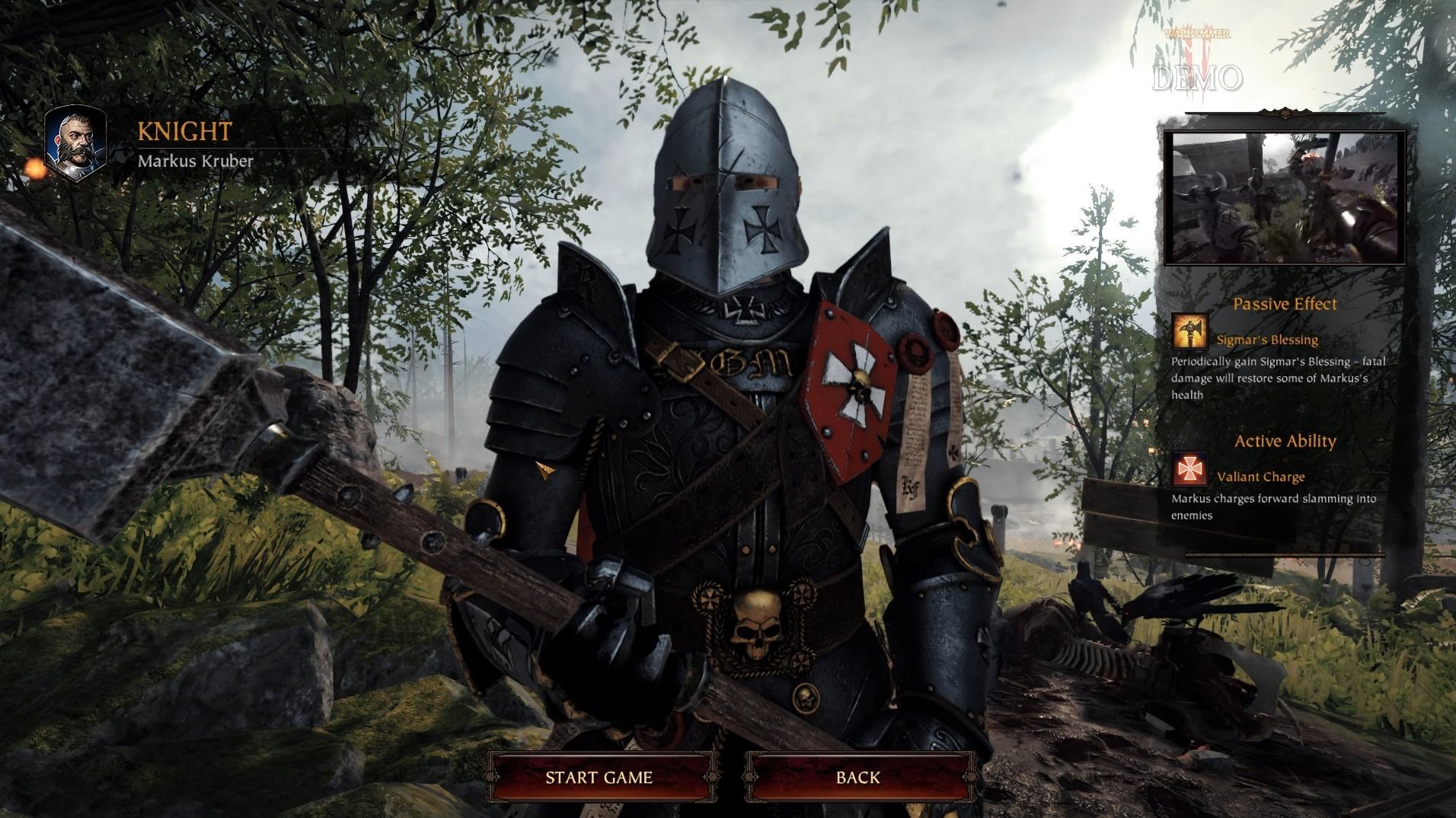 Durante la demo jugable solo hemos podido utilizar a Caballero y Sombra; Markus Kruber (Caballero) iba equipado con un enorme martillo, un arma tan lenta como devastadora. Nuestra habilidad activa era una potente carga que arrollaba a los rivales, la cual requería de cierto tiempo para volver a utilizarse. Por su parte, la habilidad pasiva era una bendición que ocasionalmente nos recuperaba vida al atacar. Además, contábamos con tres escudos de resistencia para repeler los ataques enemigos, lo que nos convertía en un personaje muy contundente.
