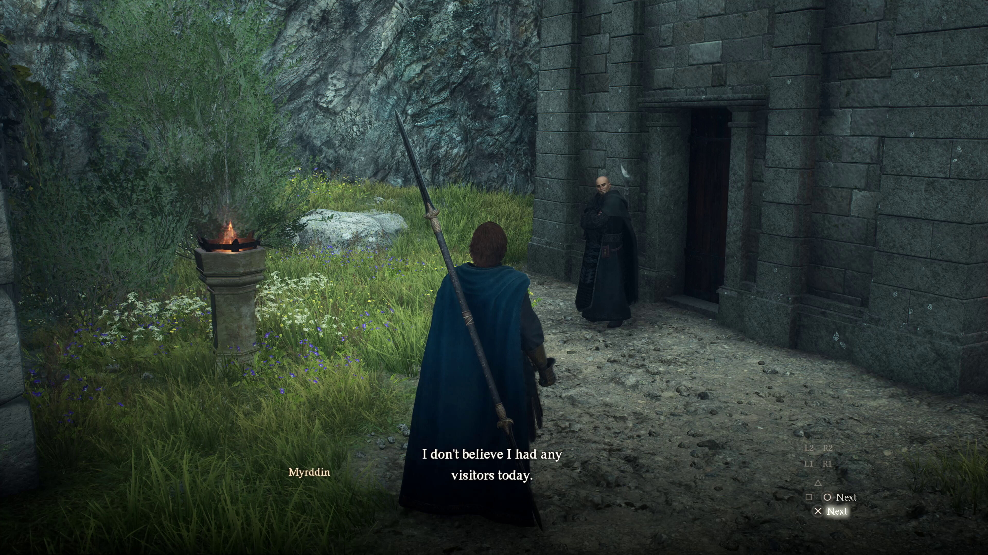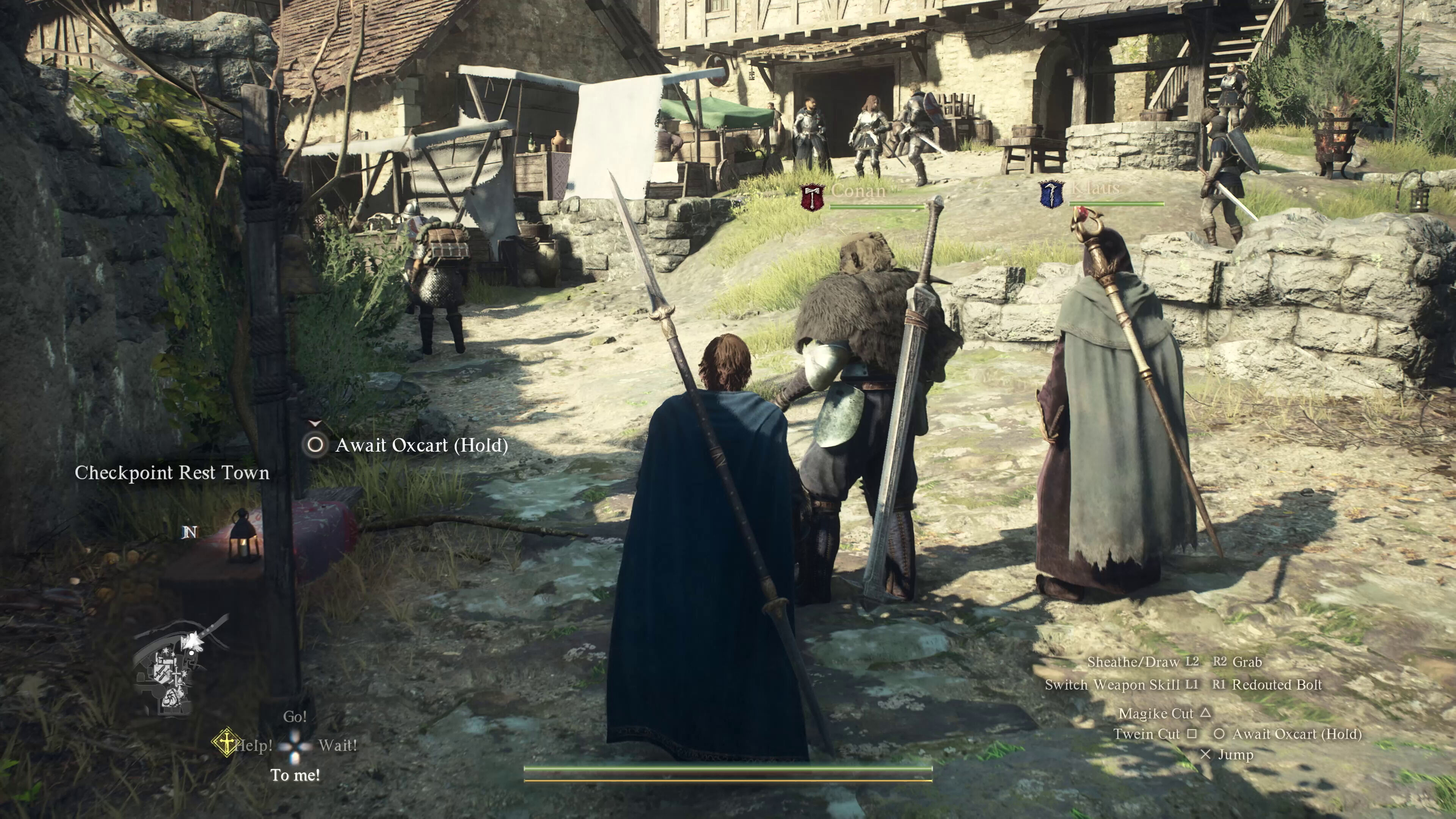Pero volvamos al chaval, o más bien, lo que ocurrió una vez lo encontramos en una cueva rodeado por lobos. En Dragon’s Dogma 2 el viaje rápido no funciona como es habitual, sino que necesitas colocar una baliza consumible en el lugar al que te quieres transportar y debes tener otro recurso agotable para utilizarla. Se nos había olvidado, así que no quedaba otra: nos tenía que seguir a pie en el largo camino de vuelta. Al llegar a la tienda de su abuelo para darle las buenas nuevas, nos dimos cuenta de que no había niño; los muchos combates contra una variedad de criaturas que nos esperaban por el sendero lo habían asustado y se había vuelto a la cueva, ya sin lobos. No iba a volver a ocurrir: nos cercioramos de colocar la baliza, fuimos a buscarlo de nuevo, nos lo echamos al hombro como quien coge un saco de patatas, y nos teletransportamos al pueblecito. El abuelo, repleto de júbilo, no se podía imaginar que después de todo el lío pensamos en tirar el chaval por un puente, lo que habría terminado la misión de una manera muy diferente.