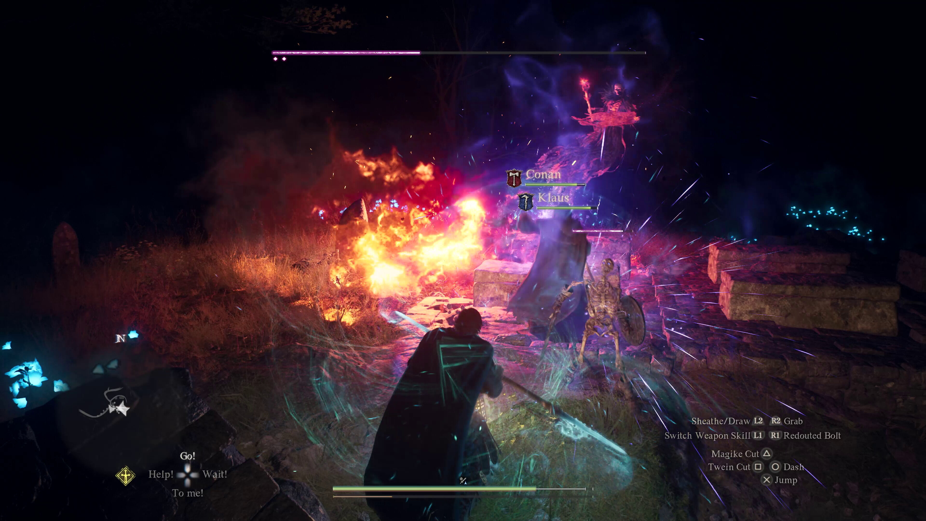 Mientras hacíamos esa misión pasaba el tiempo para otra que habíamos aceptado: rescatar a un chaval de un supuesto ataque de lobos a las afueras. Si tardábamos más, lo más probable es que cuando llegáramos quedara poco del chaval. Pero no hicimos mal en tardar un poquito: se hizo de noche, cuando en el mundo hay más peligros y necesitamos encender el farol para ver algo, pero esto nos permitió seguir el rastro de las flores iridiscentes que el muchacho salió a buscar. Pero en un mundo así es complicado no salirse del camino: nos llamó la atención un pequeño cementerio. Menos mal, porque si no nos hubiéramos perdido un combate delicioso contra un fantasmagórico minijefe que acabó siendo mucho más duro y espectacular de lo que podíamos prever.