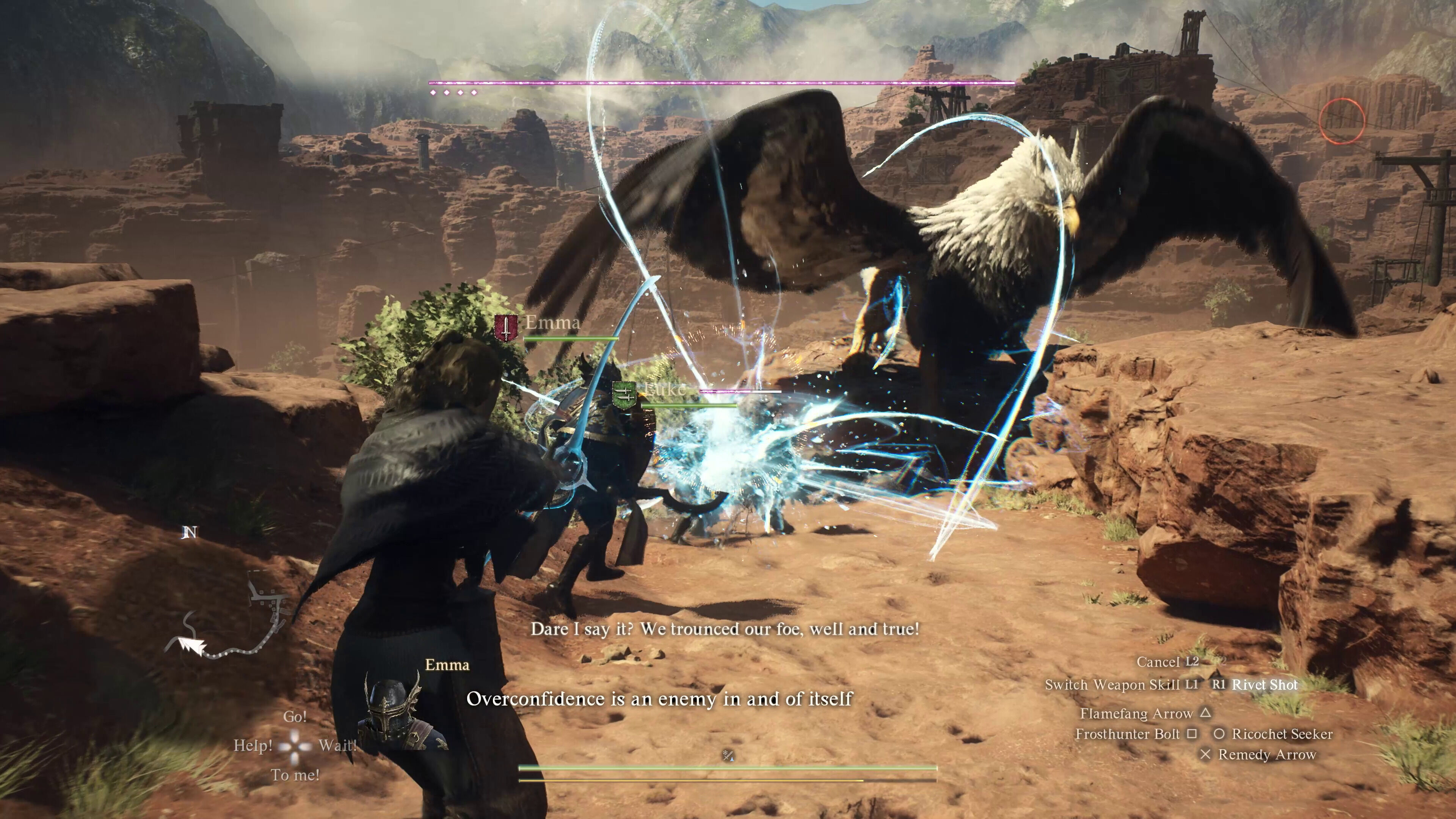 Si esto no es algo scriptado, si es un sistema del mundo de Dragon’s Dogma 2, solo lo podemos calificar de increíble. La verdad es que no nos extrañaría que así fuera, porque en este mundo no paran de ocurrir cosas interesantes que permiten atisbar un montón de sistemas subterráneos que logran que se perciba realmente vivo. Por ejemplo, hubo un momento en el que estábamos luchando contra un enorme gólem: era muy resistente y solo lo podíamos dañar al golpear, con nuestras flechas o escalando por él, en puntos concretos de su cuerpo, todo ello mientras esquivamos sus golpes y lanzamientos de piedras. En esas estábamos cuando llegó un grifo, aún más temible que el otro enemigo, y se pusieron a pelear como ocurre a veces en Monster Hunter.