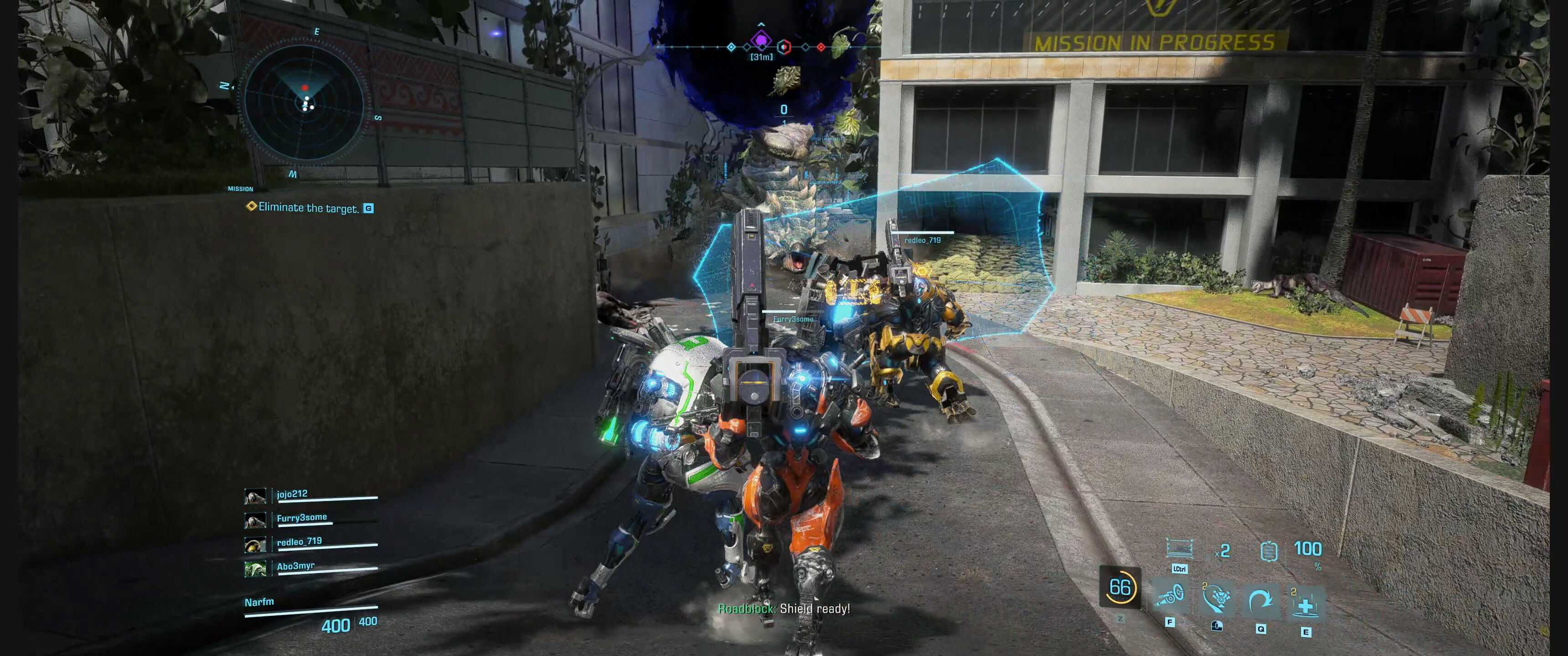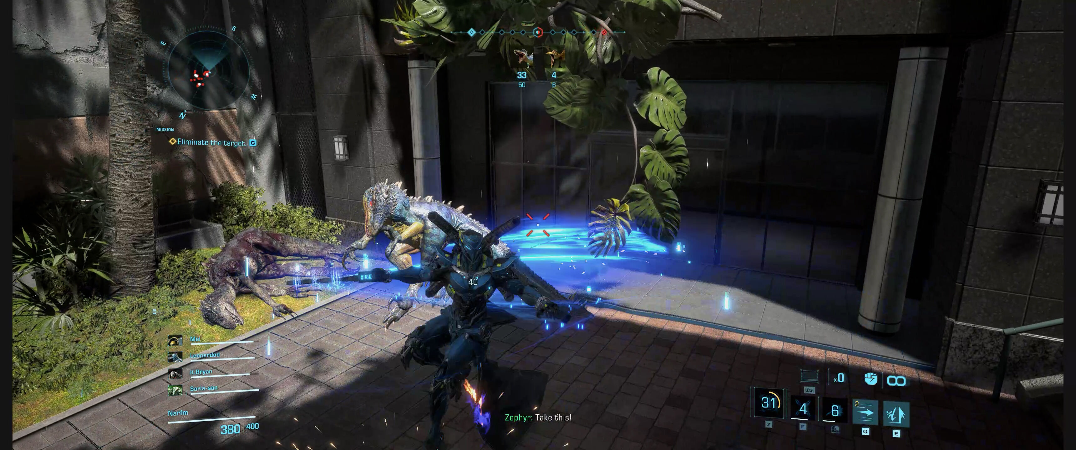 Así, hay exoarmaduras centradas en la curación de los aliados que también pueden hacer algo de daño a los enemigos cuando sea necesario, otra que parece una adaptación de Reinhardt de Overwatch, y un par que están centradas en el daño de manera muy diferente: una de ellas es tu personaje de shooter en tercera persona habitual, capaz de disparar granadas que lanzan por los aires a decenas de dinosaurios y con esquivas rápidas; otra transforma el juego en un hack and slash, con habilidades muy centradas en el movimiento y un satisfactorio espadazo que lanza por los aires al adversario para dejarlo a nuestra merced.
