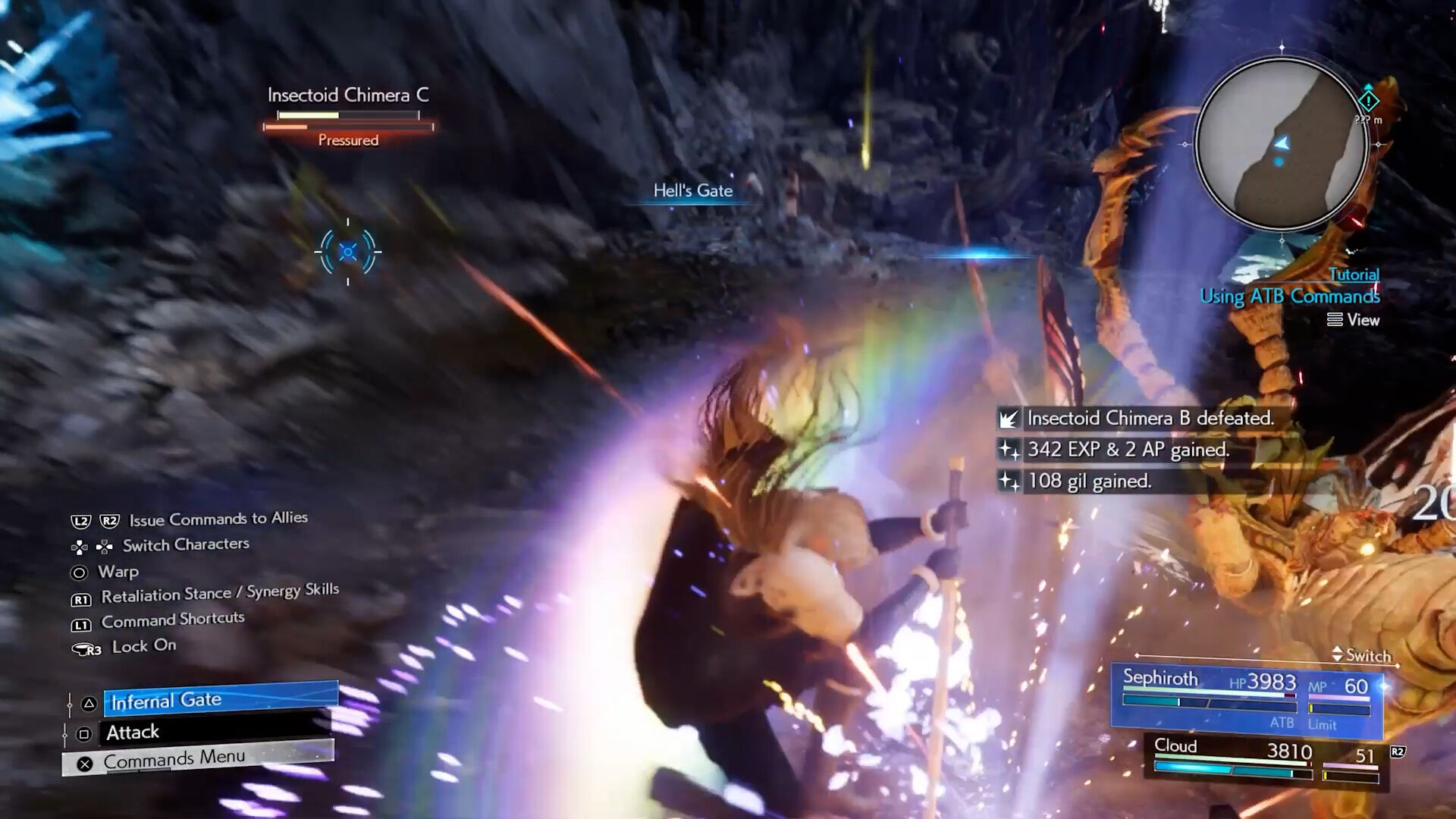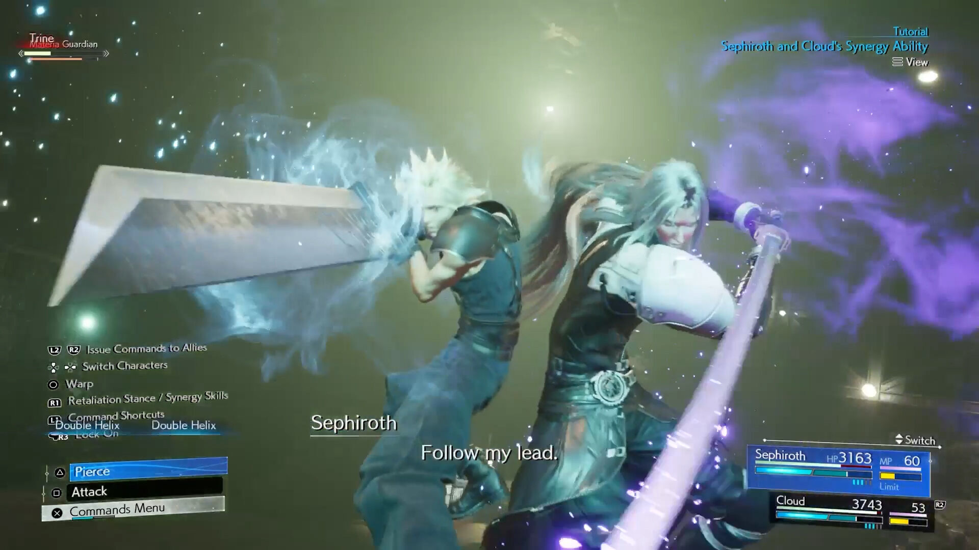 El sistema de combate es tan brillante como en Remake, que sorprendió a aficionados a los juegos de acción y a fans de los turnos con una mezcla muy bien pensada, pero aquí hay novedades más allá de las materias nuevas, de las habilidades inéditas y de los aliados que se suman a las contiendas, cada cual con su plantel de movimientos. Lo más destacable son las habilidades sincronizadas: cuando un personaje utiliza habilidades se llena la barra de sincronización, lo que incita todavía más a dar órdenes constantemente a los dos personajes del grupo que no estamos controlando activamente. Las habilidades sincronizadas consumen parte o la totalidad de esa barra: son movimientos conjuntos espectaculares en su puesta en escena que implican a un dúo, en este caso Cloud y Sefirot, pero un mismo héroe puede tener habilidades sincronizadas de diferente efecto con varios compañeros.