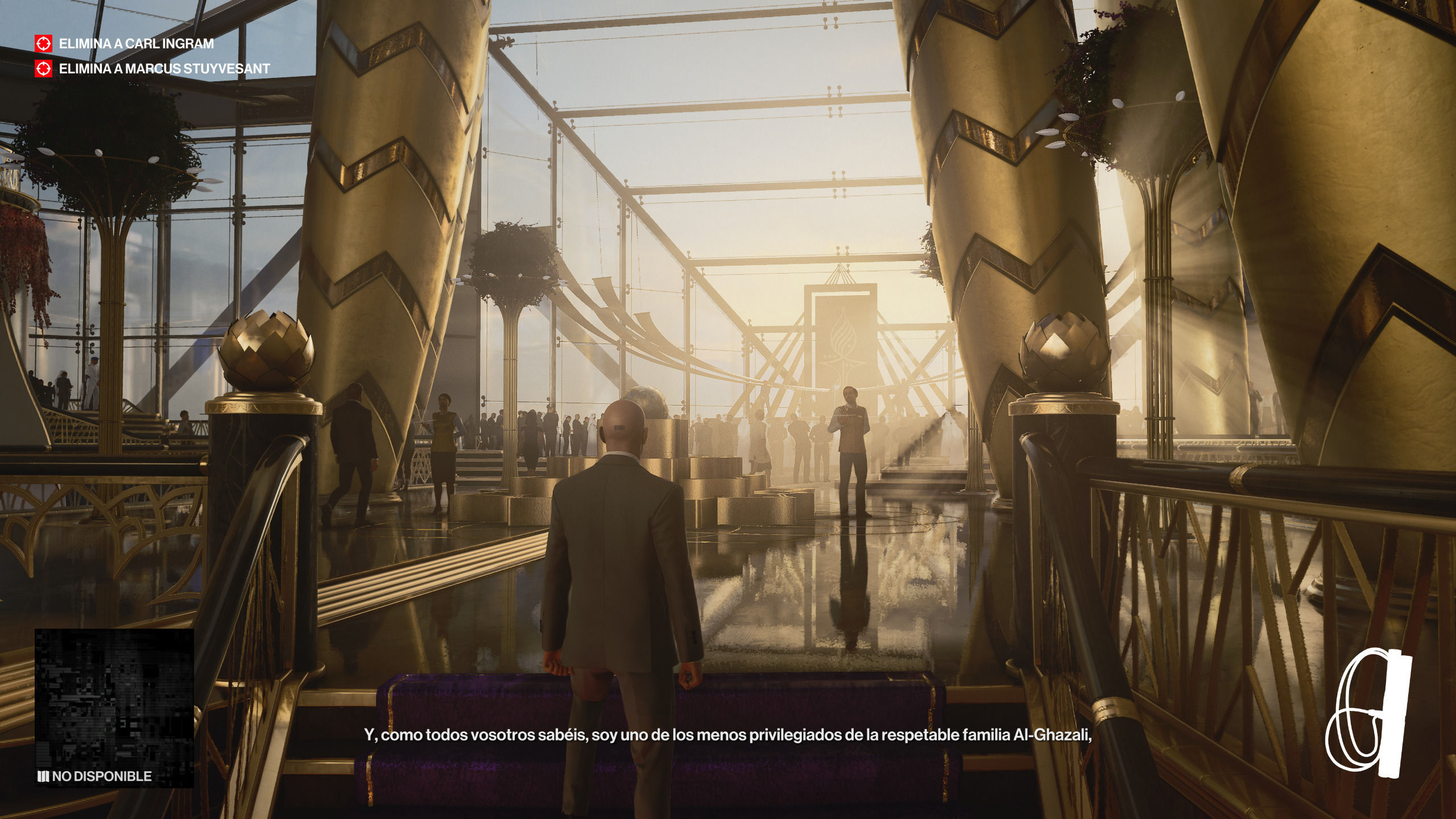 Tras quitarnos nuestro traje de "paraca" y ponernos una ropa de lujo accedemos a este evento lleno de glamour desde el que podemos ver unas impresionantes vistas y todo el lujo presente en esta ubicación de Dubái, con paredes llenas de oro, grandes vidrieras, estanques artificiales y en líneas generales una oda a la grandilocuencia y un escenario muy llamativo a la vista para estrenarnos con nuestros primeros asesinatos en Hitman 3.