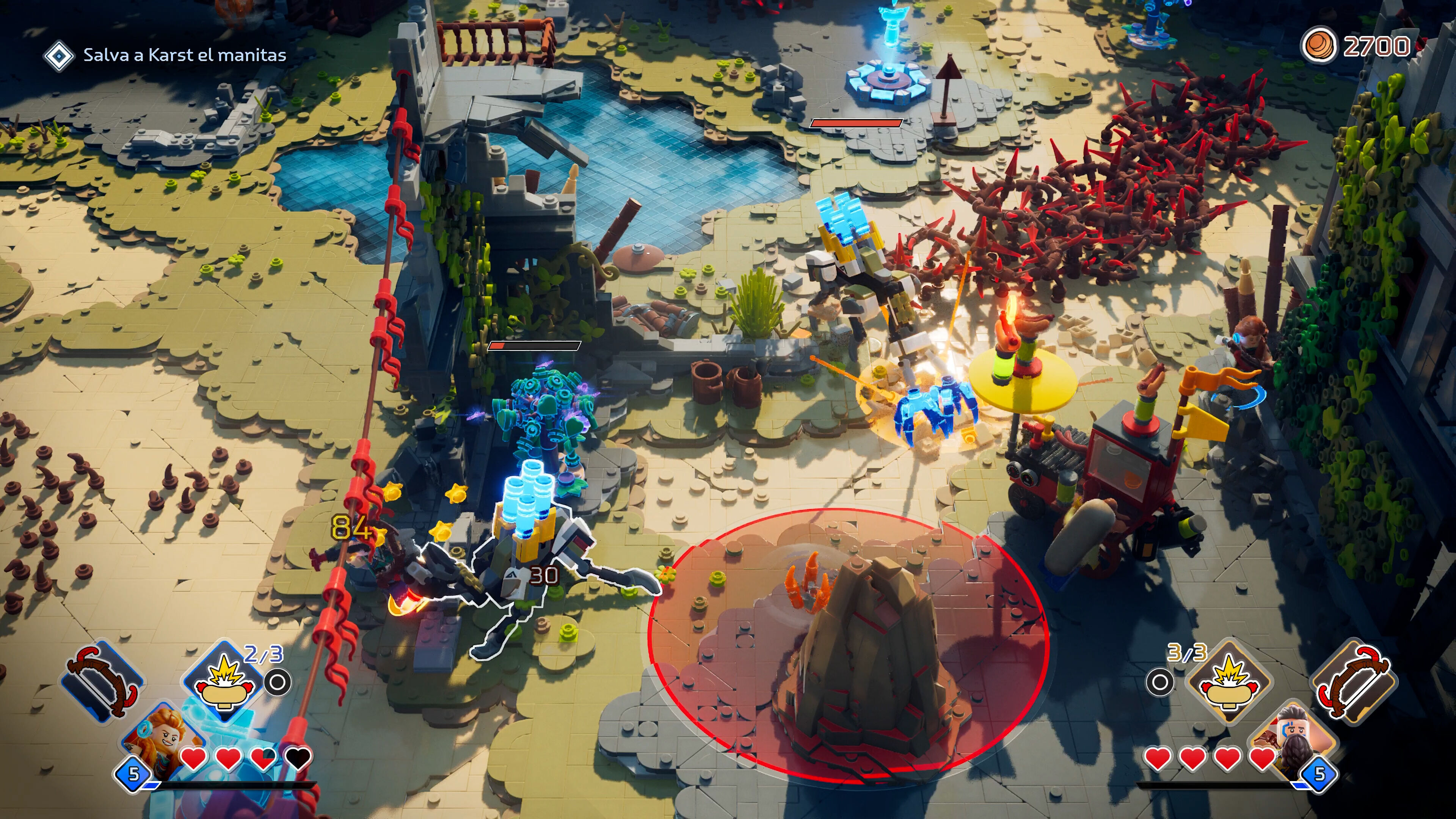 Además de sus armas principales, que mejoran conforme se sube de nivel, durante las fases conseguiremos objetos de ataque que se consumen tras varios usos y que son muy útiles. Los hay más normalitos, como unas botas que nos permiten saltar y caer incendiando a los oponentes o un arco que dispara en cono varias flechas; y otros mucho más absurdos, como un carrito que podemos colocar en un punto para que caiga una lluvia de perritos calientes explosivos. Esto puede parecer disparatado, que no encaja en el mundo de Horizon, pero os aseguramos que este humor tontorrón sí casa con la narrativa de LEGO Horizon.
