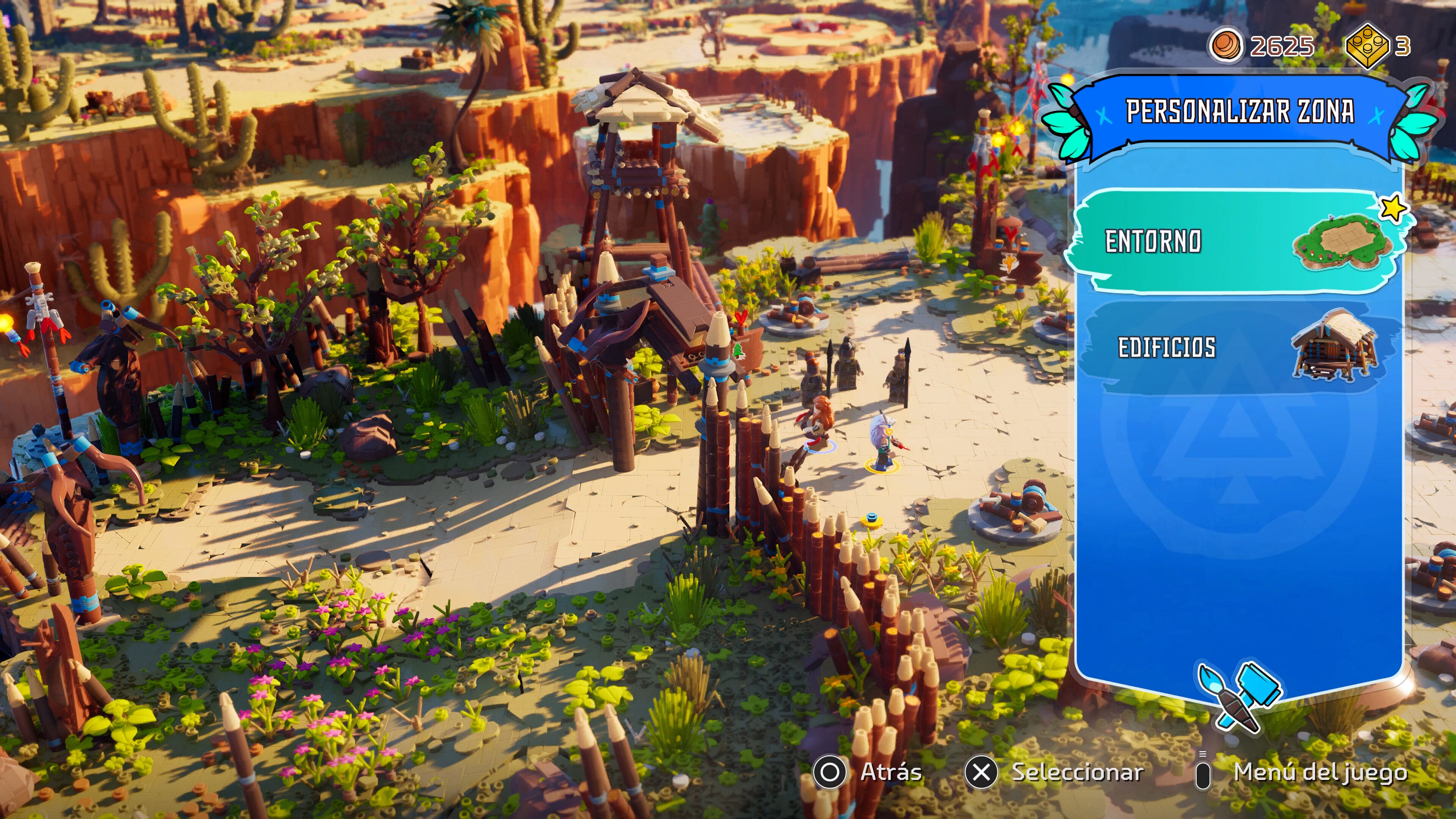 Una base, por cierto, que podemos personalizar de diferentes maneras. Podemos cambiar tanto el estilo artístico de la zona como el de los edificios, utilizando elementos de LEGO Horizon inspirados en las distintas tribus de este universo, como de distintas colecciones de LEGO originales, es decir, no licenciadas, como parques de atracciones y Ninjago. Para desbloquear esos elementos necesitaremos gastar las piezas que conseguimos durante los niveles, y que también se usan para personalizar estéticamente a Aloy y el personaje controlado por el segundo jugador: hay trajes de Horizon, pero también disfraces de perritos calientes.
