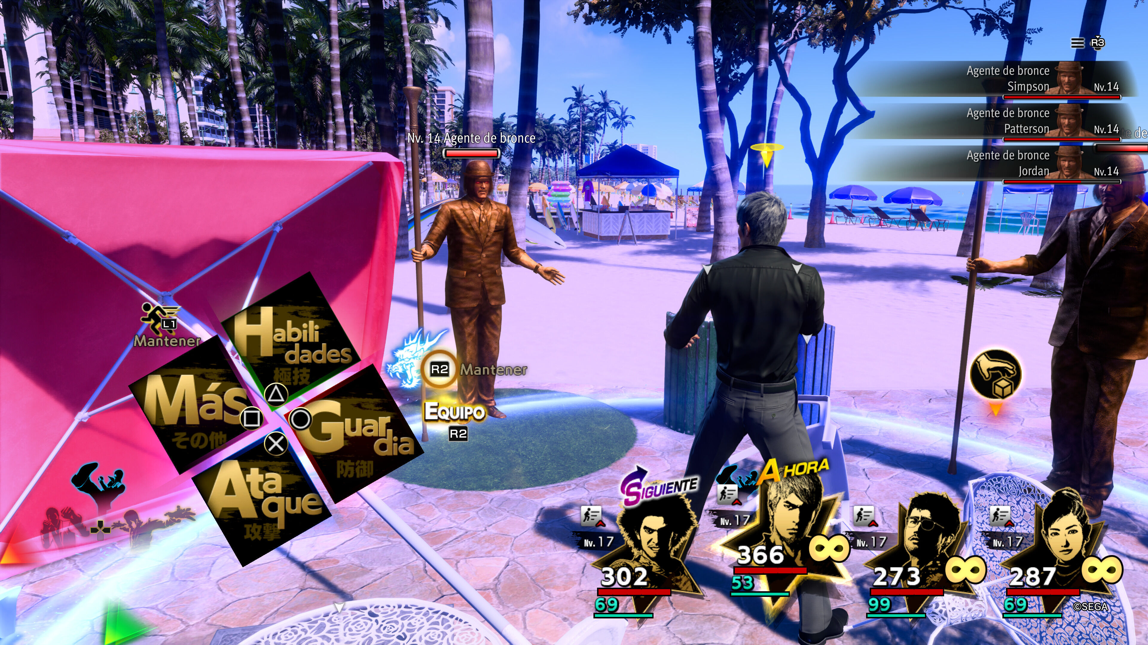 El mapa de Hawái cambia el tipo de ambientación al que estamos acostumbrados con Yakuza/Like a Dragon, aunque el funcionamiento en la práctica es similar. Encontrarás restaurantes en cada calle para reponer fuerzas y fortalecer el vínculo con tus compañeros, algo que también puedes hacer si activas diálogos en puntos concretos –están señalados en el minimapa- para ir marcando un bingo sobre la información de cada amigo. Profundizar en esto tendrá ventajas en los combates, así que merece la pena escuchar sus anécdotas.