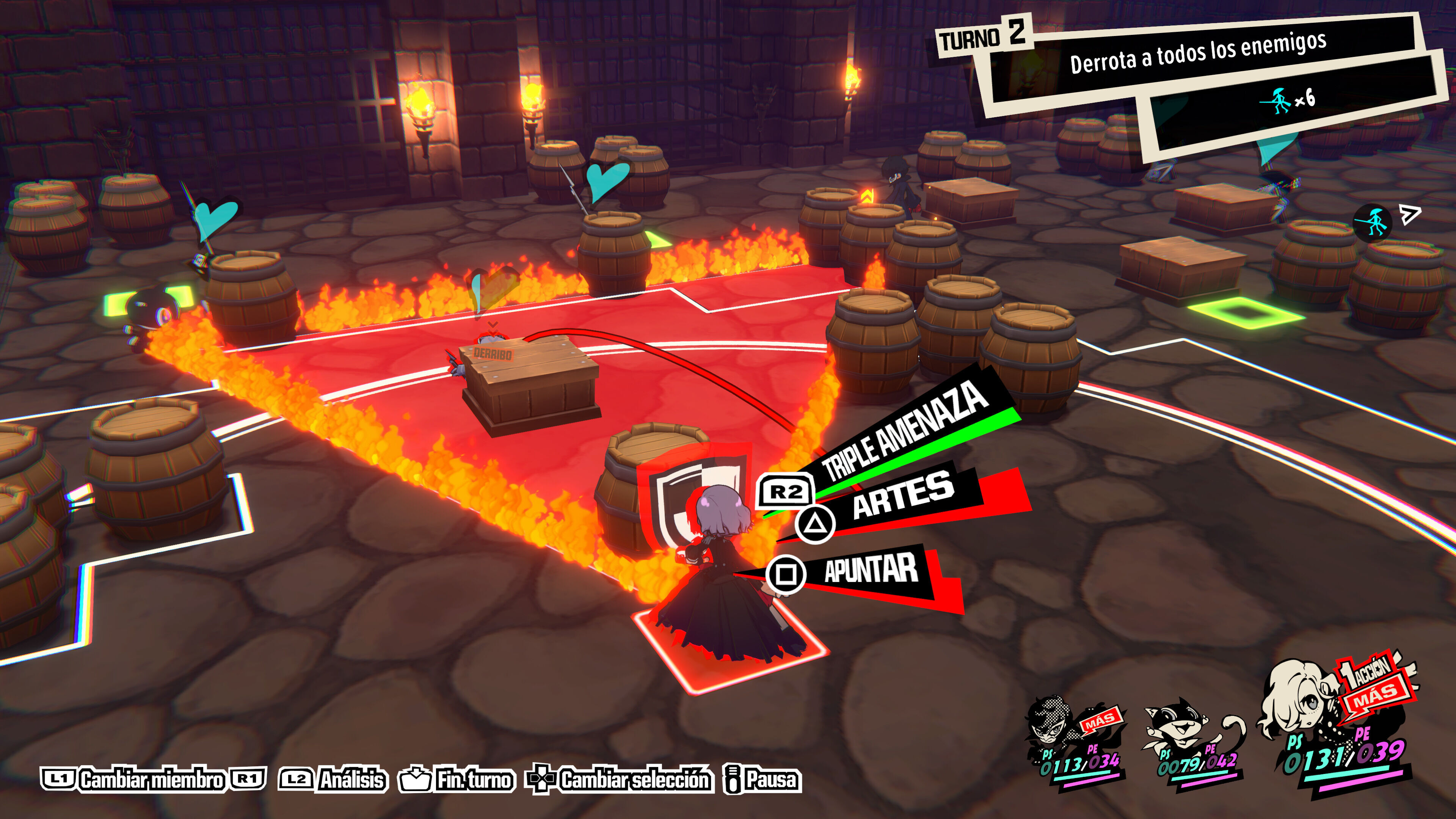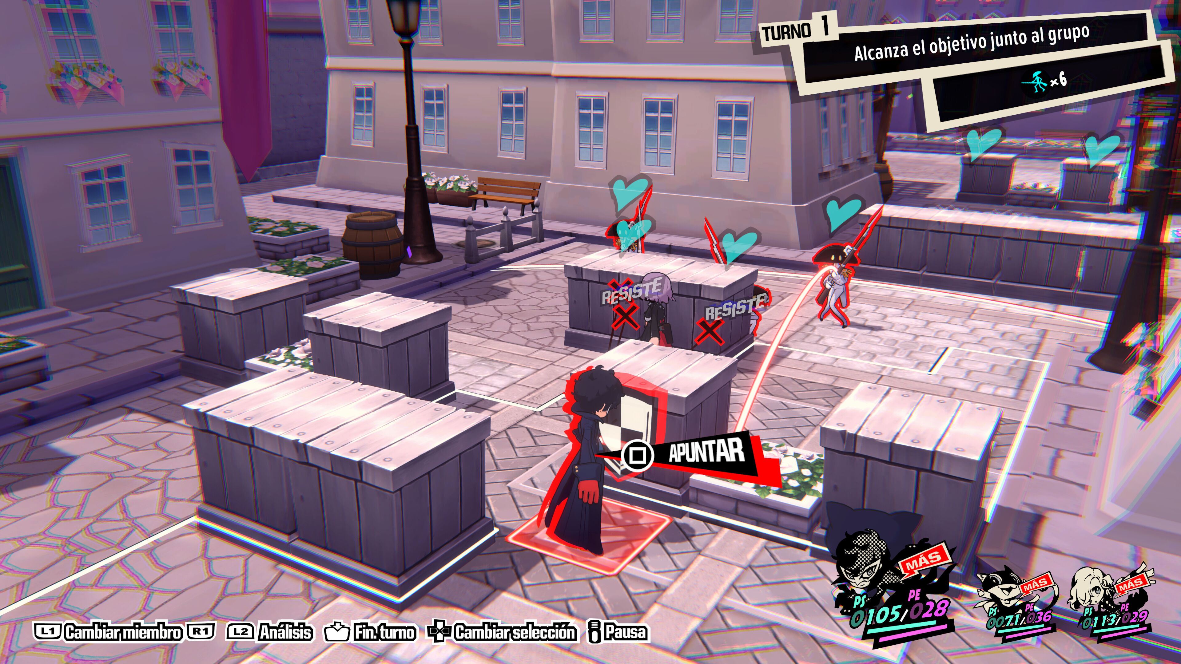 Esto da lugar a ingeniosas maneras de adaptar el turno extra visto en los Persona: si atacamos a un enemigo expuesto, ganamos otro turno que puede ser muy valioso para rematar al rival o dañar a otro. Claro, los enemigos también juegan esta carta y si atacan a una de nuestras unidades ganan ese "1 Más" de regalo. Es por eso que en Persona 5 Tactica las coberturas son muy, muy importantes, sean parciales o completas; la altura del objeto y un color del escudo nos indicarán si estas protecciones eliminan el daño enemigo o lo reducen en una buena cantidad. Desde estas posiciones unas líneas nos indicarán claramente los objetivos que están a tiro y aquellos que no se pueden dar desde ese ángulo; ten en cuenta que si estás detrás de una protección completa y no en una esquina, tampoco podrás disparar.
