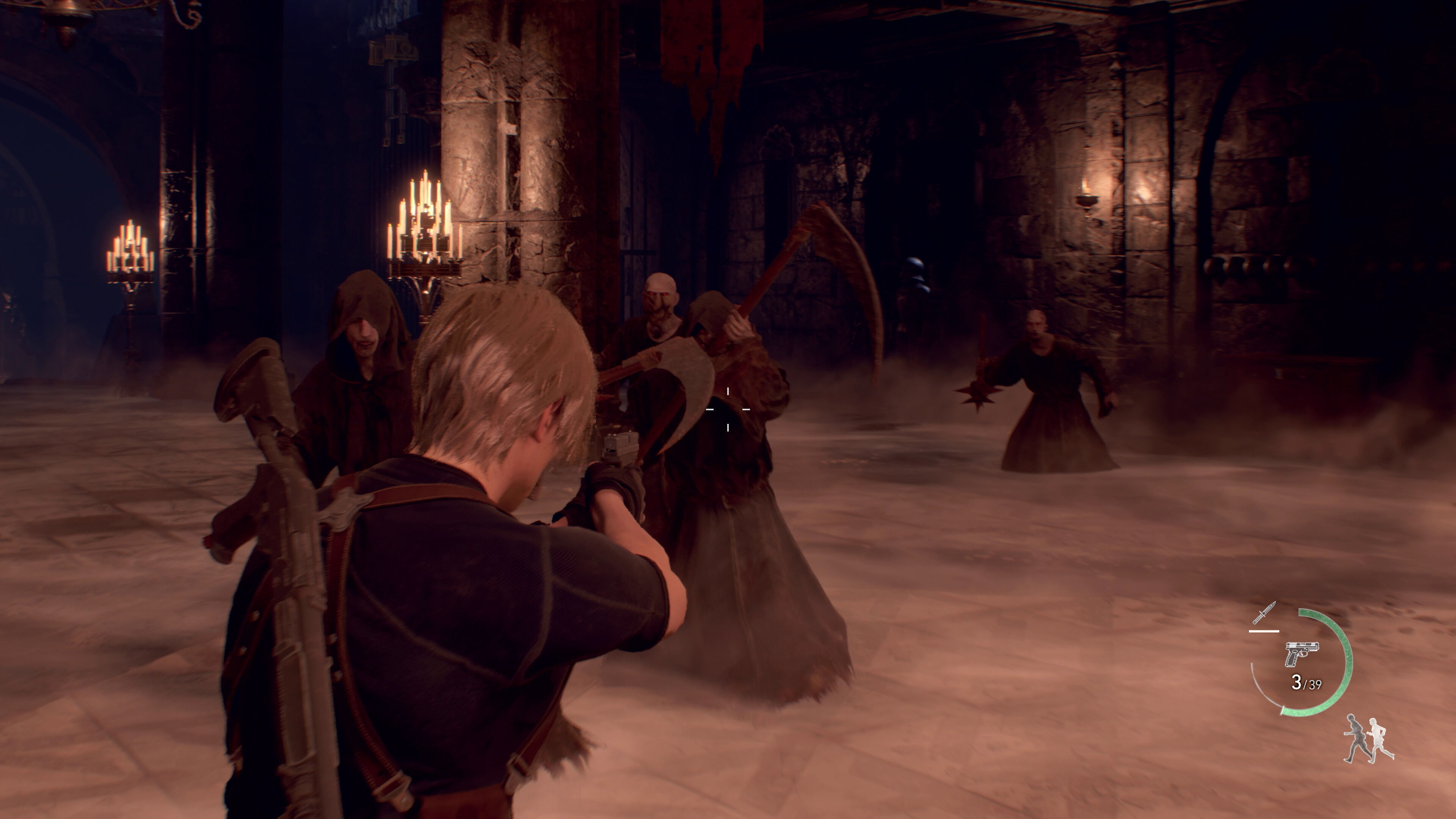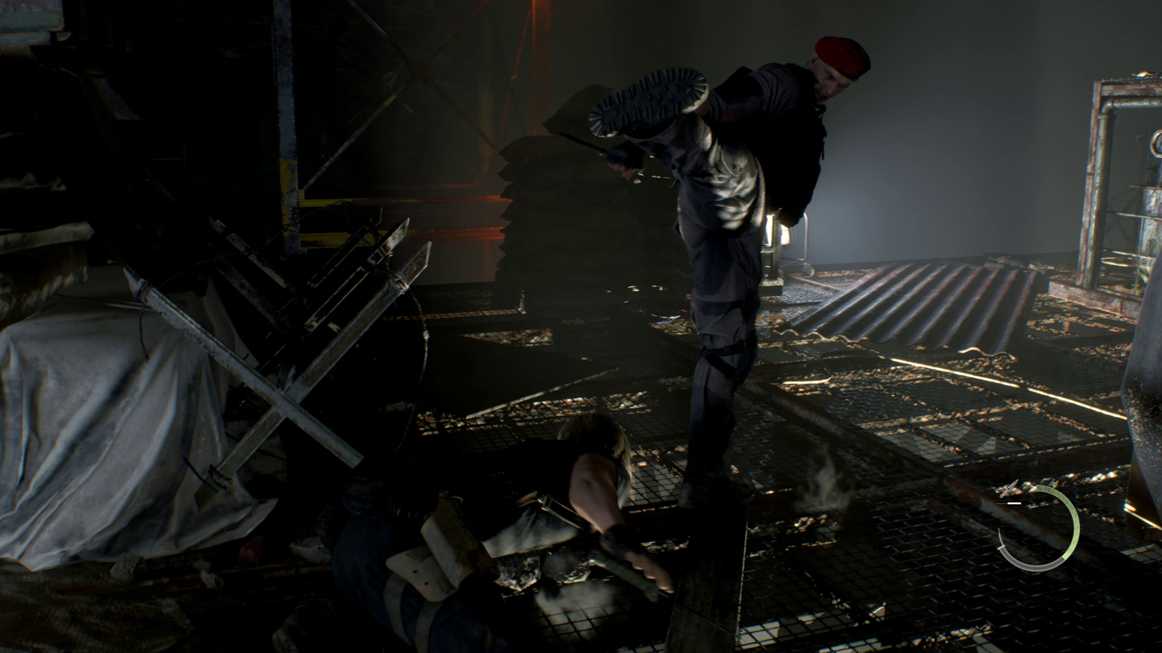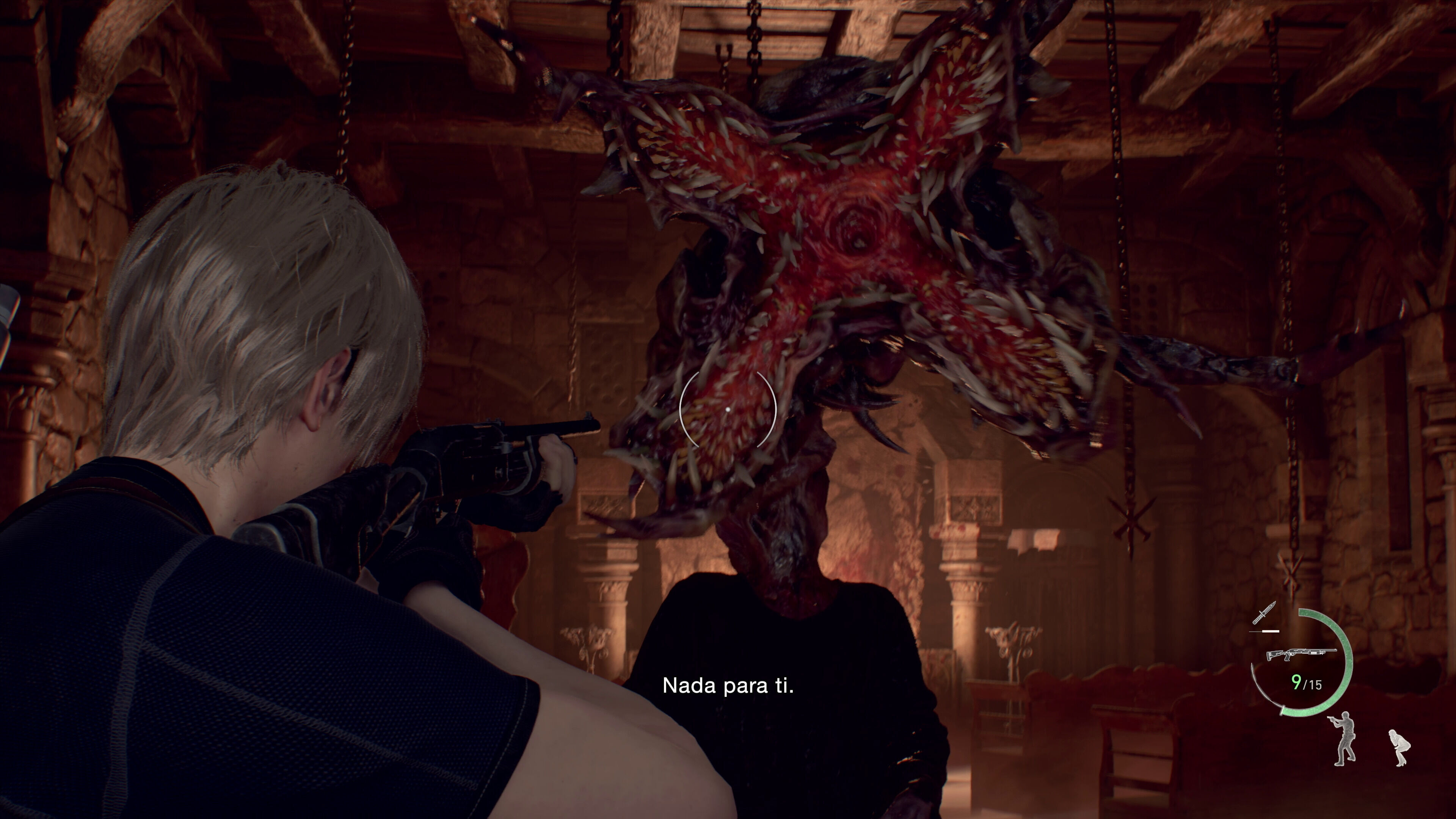 Además, se ha introducido una mecánica de parry con la que podremos bloquear los ataques de los enemigos si usamos el cuchillo justo cuando vayamos a recibir un golpe, algo que se indica con un icono que se ilumina en la parte inferior derecha de la interfaz. Esto no solo nos servirá para defendernos cuerpo a cuerpo, pues hemos llegado a ver a Leon devolver un cartucho de dinamita de esta manera. Eso sí, nuestro cuchillo tiene ahora una durabilidad limitada, así que es de esperar que no podamos abusar demasiado de esta maniobra. Igualmente, hay algunos movimientos que no pueden ser bloqueados, aunque en estos casos los podremos esquivar si presionamos el stick derecho cuando se nos avise de ello.