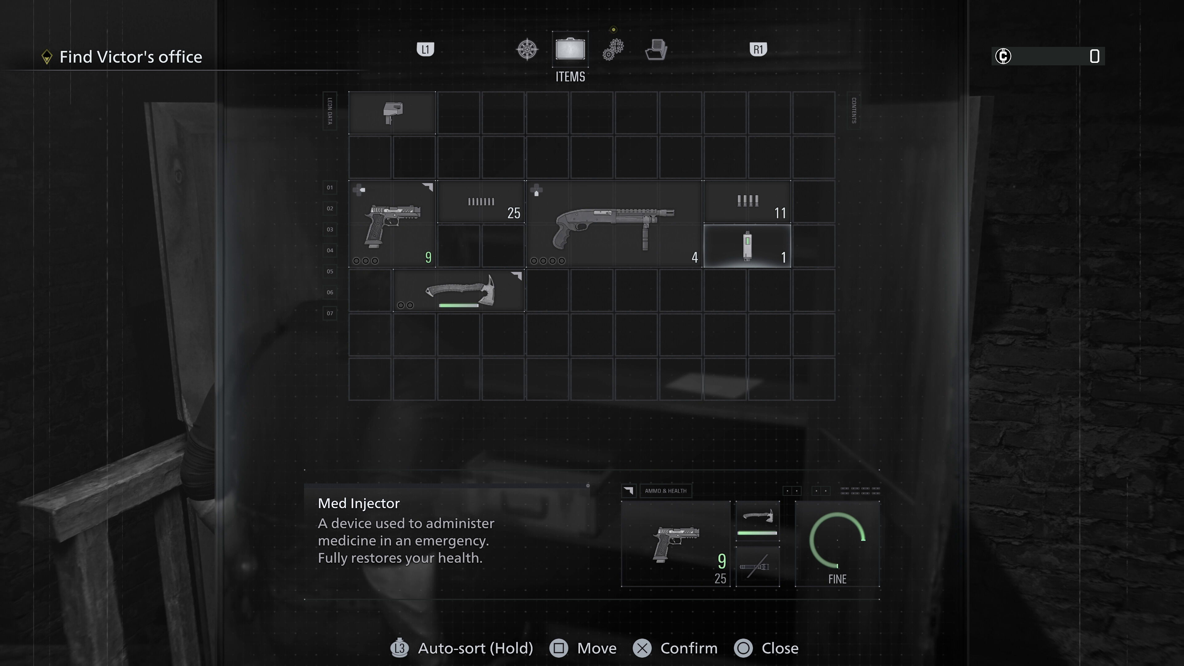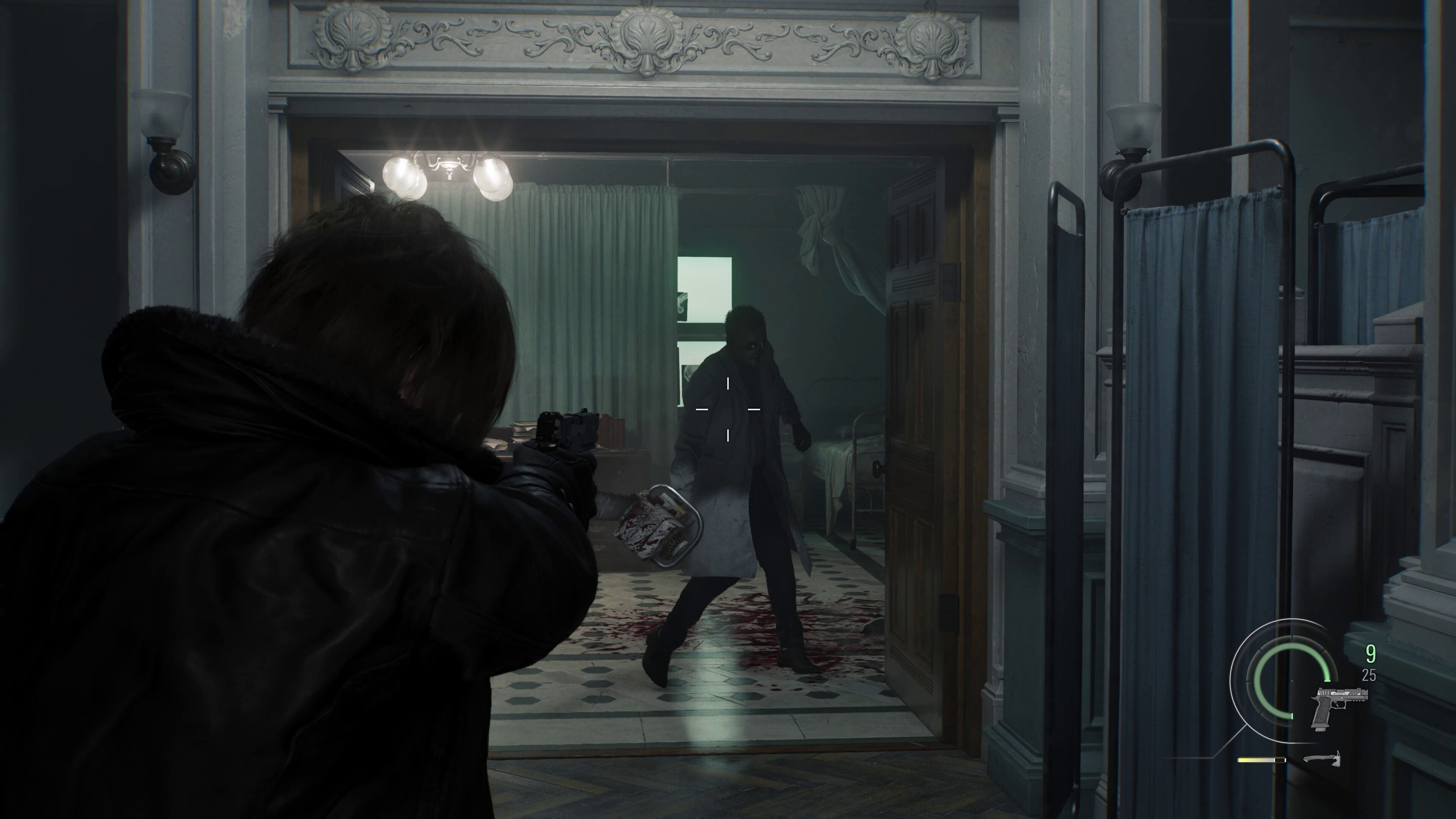 Luego está la gestión del inventario, que cuenta con muy pocos espacios y en cuanto avanzamos un poco nos dimos cuenta de que teníamos que empezar a priorizar y descartar objetos o combinarlos (al estilo de las tradicionales hierbas verdes). Luego hay una novedad muy interesante, que consiste en recoger la sangre de los infectados abatidos para fabricar munición. No es un detalle menor, y a partir de descubrir esta mecánica las balas disponibles ya no supusieron un elemento tan agónico.