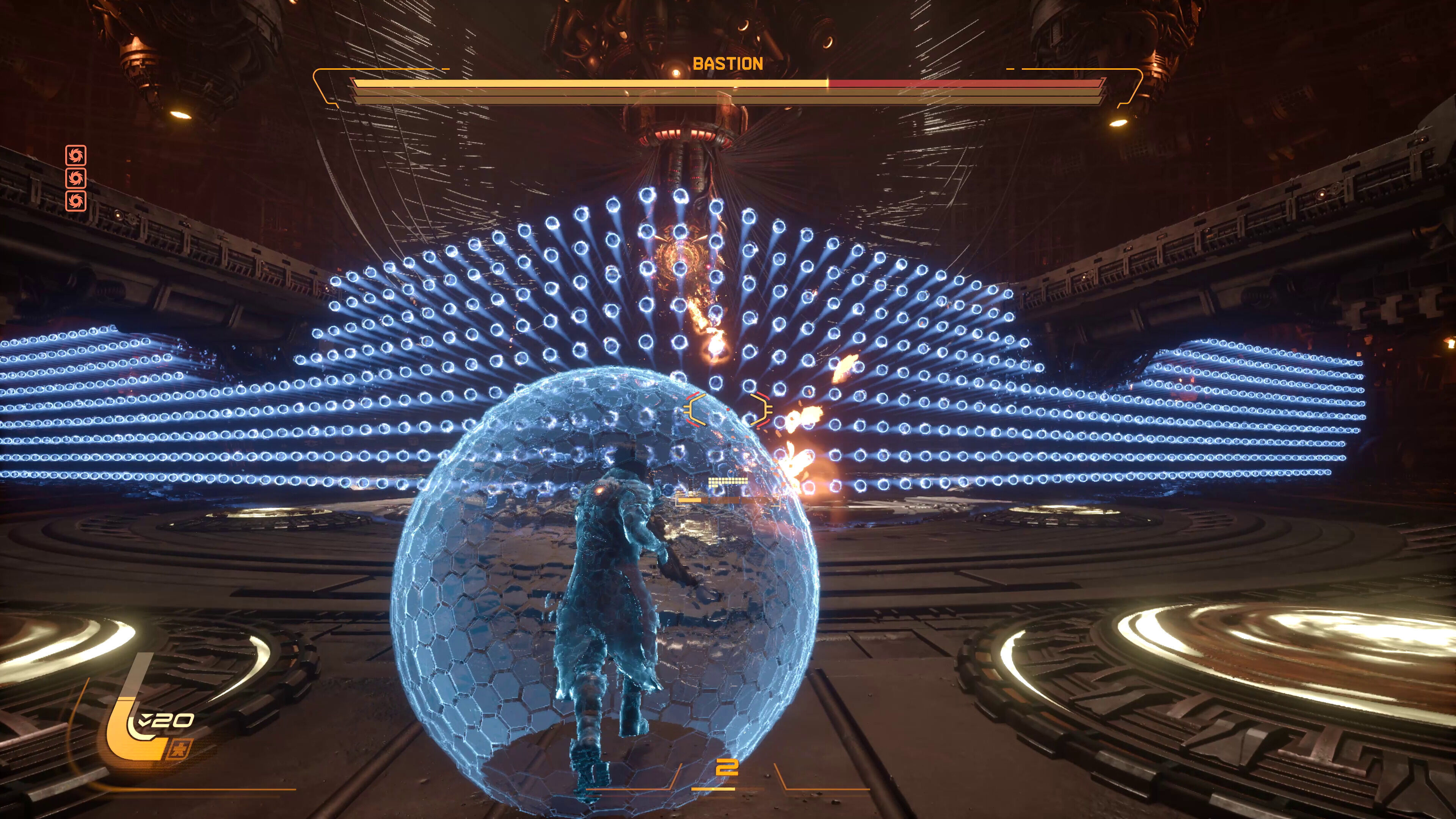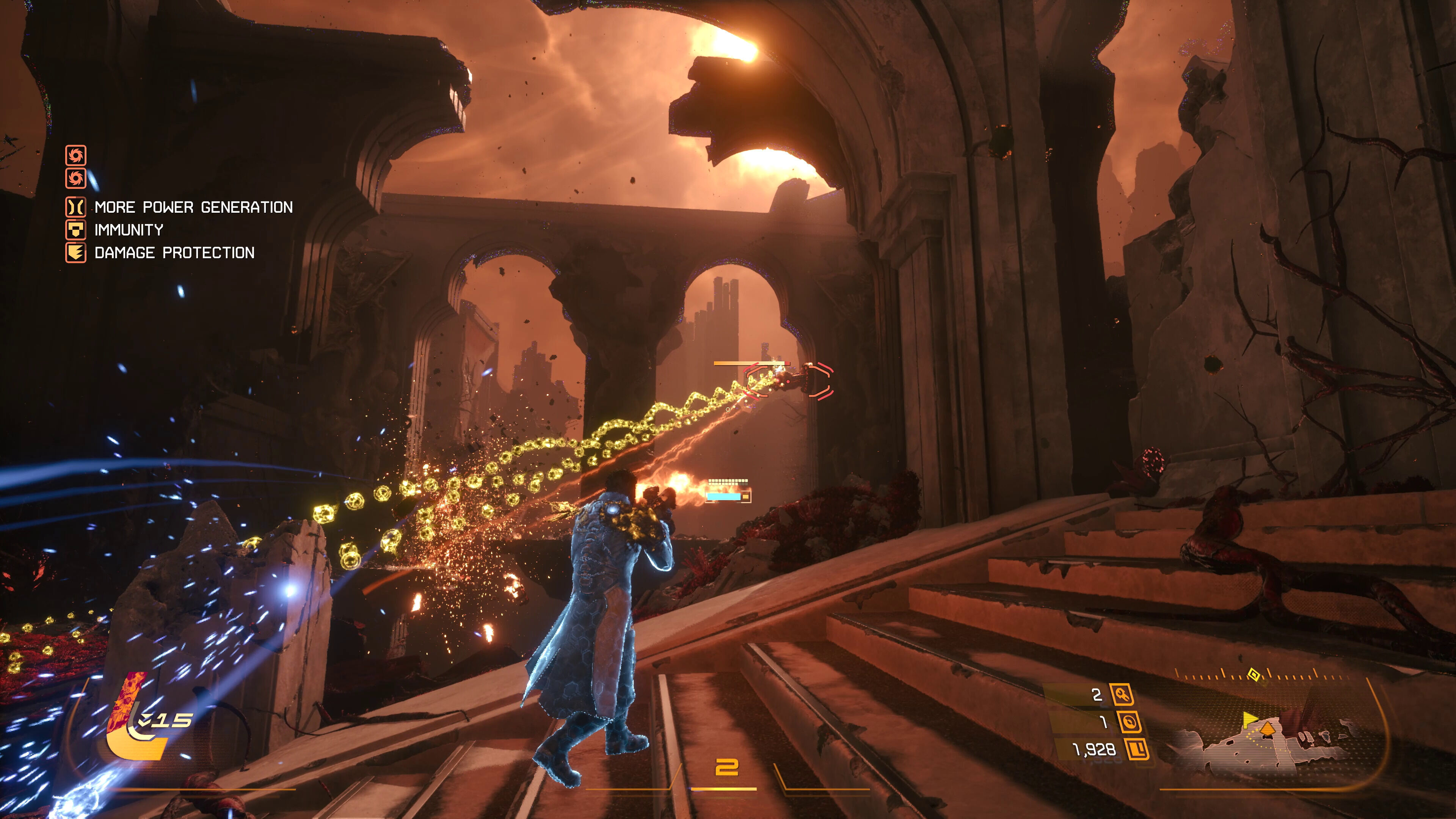 Se trata del perfil defensivo. Podemos activar un escudo temporal manteniendo pulsado R1, algo que va más allá de evitar que nos alcancen los disparos, y es que podemos recoger la energía de los disparos que se dirigen hacia nosotros. Una vez relleno nuestro indicador, podemos lanzar un ataque especial en forma de misiles con la capacidad de fulminar a los enemigos, lo cual resulta en ocasiones más efectivo que hacer uso de la pistola, el rifle o la escopeta de turno. En ciertos enemigos es incluso un factor estratégico-tactico, y con el jefe al que nos enfrentamos directamente se convirtió en una mecánica imprescindible.