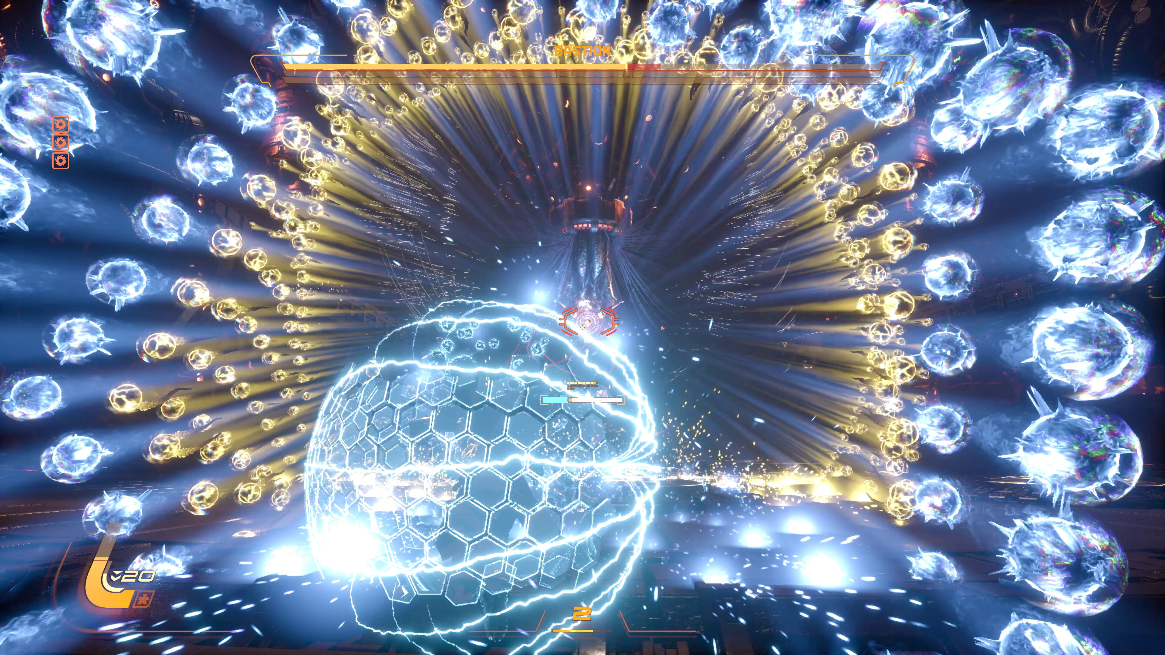 Saros se basa en el ataque, defensa y contraataque, en combates que se vuelven prácticamente una coreografía shooter. En un perfil ofensivo es preciso apuntar bien, aunque hay un apoyo de apuntado automático que se puede regular a tu gusto en el menú de ajustes. Es importante en este sentido hacer uso del acelerón para esquivar los ataques enemigos y moverte rápido por el escenario. Pero luego viene una de las partes más originales de lo nuevo de Housemarque y que explica por qué nos ha llamado la atención.