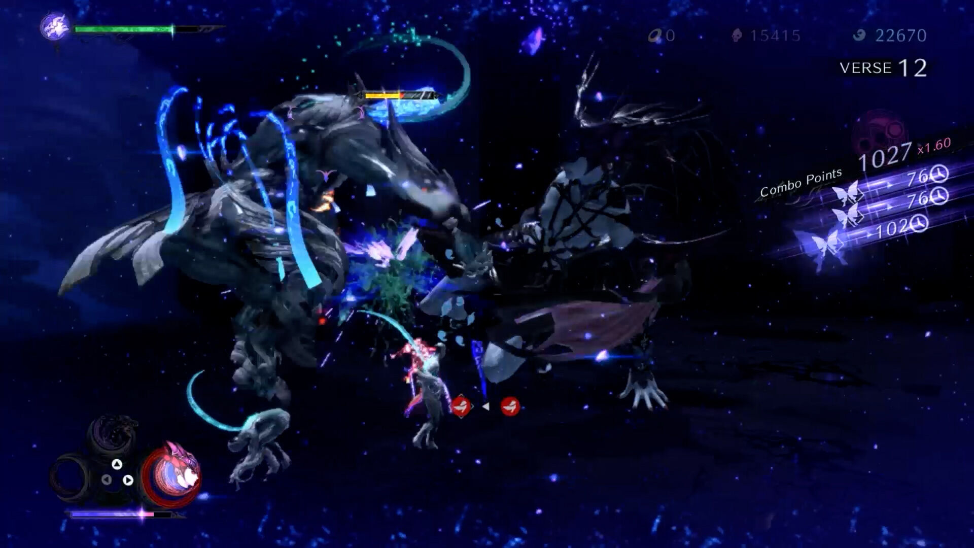 La vuelta de tuerca a todo esto, la capa de profundidad (¡y qué profundidad!) extra, está en la invocación de demonios. No es un simple gimmick, no es algo que nos planteemos dejar como última opción porque nos basta con los poderes de Bayonetta para conseguir el Platino Puro, no es una apuesta por la espectacularidad visual sobre la jugabilidad, y tampoco es una mecánica sin demasiado poso que hayan introducido para evitar que YouTube se llene de vídeos titulados "el mismo juego 3".
