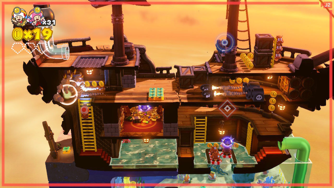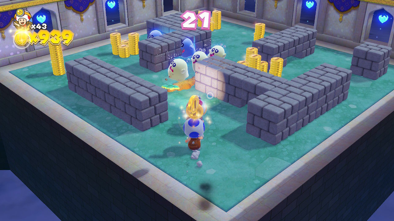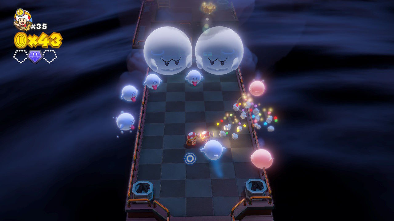 Si jugamos en solitario, esto se consigue al recoger duplicerezas, ya que con el foco de dos Toad eliminamos a las oleadas de fantasmas que nos atacan. Y la otra manera es jugando con dos jugadores en el modo cooperativo, una posibilidad que si por no lo sabíais llegó el pasado mes de febrero mediante una actualización gratuita.