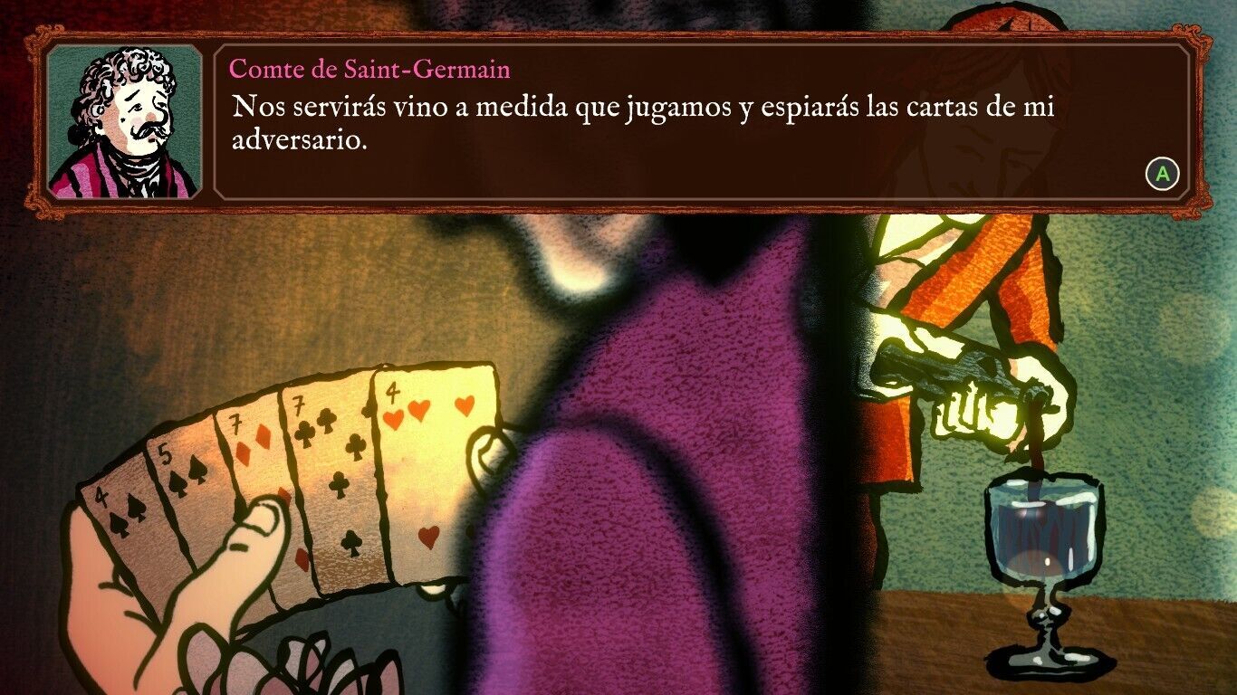 En ese sentido hemos podido intuir un ritmo lento, pero agradable para quienes no tengan prisa en jugar sin pensar. Card Shark es un juego de Nerial y, como tal, la faceta narrativa va a tener un gran peso: en esta preview ya hemos podido leer diálogos muy bien trabajados, hemos conocido a personajes genialmente construidos (muchos basados en figuras reales de la Francia del siglo XVIII, como el propio Conde de Saint Germain o el ilustrado Voltaire) y hemos viajado a varias localizaciones del país vecino. Buena parte de las horas que le hemos dedicado al juego han estado dedicadas exclusivamente a la introducción, lo que a efectos prácticos se podría entender como un extenso tutorial guiado por la trama. No pesa, en realidad, pero queda dicho que todo apunta a que vamos a necesitar echarle un buen rato antes de que nos dejen volar en libertad para escoger qué trucos queremos hacer en nuestras partidas; hasta entonces, el juego nos guiará indicándonos casi en todo momento lo que tenemos que hacer.