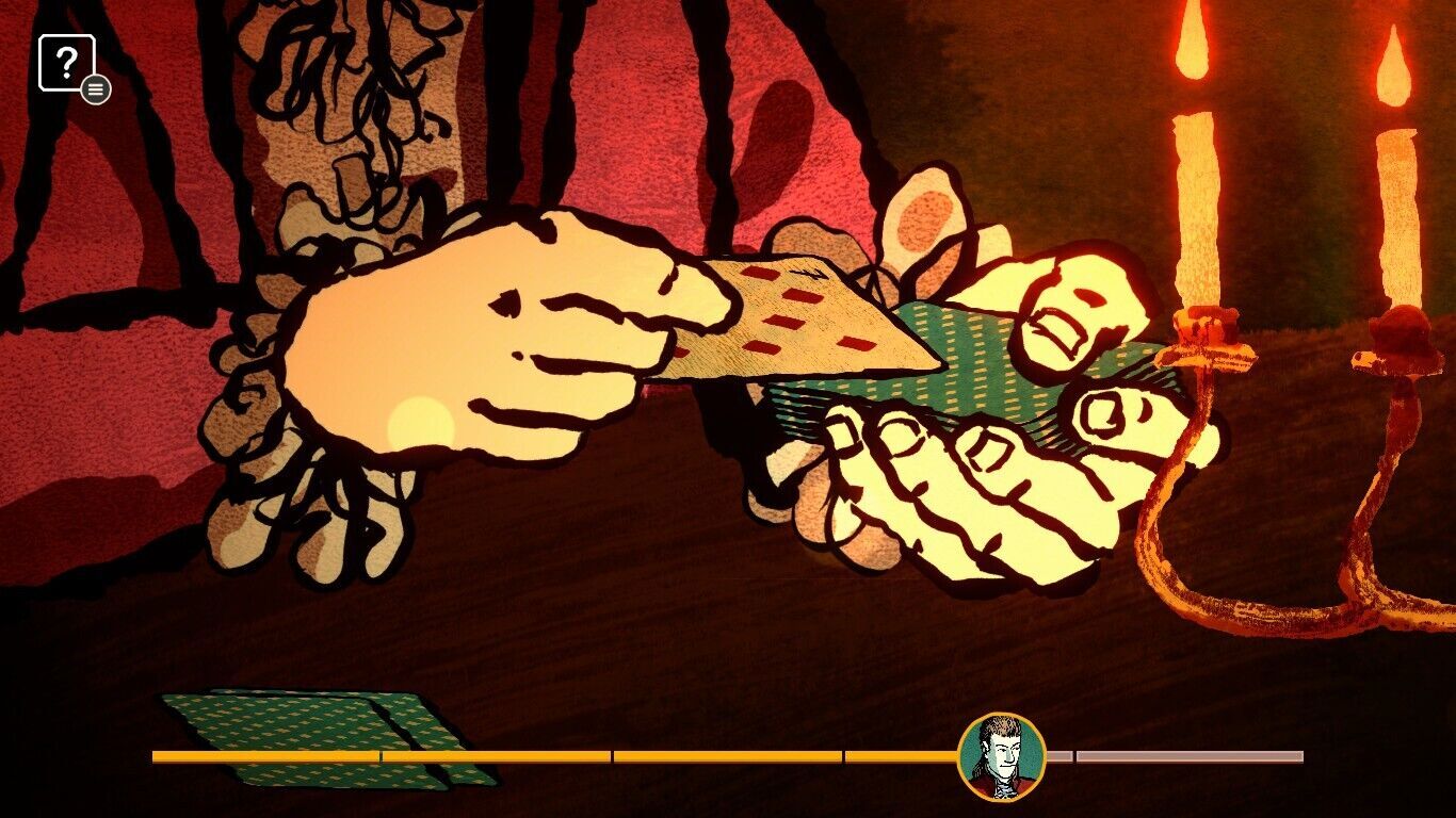 De primeras, una de las cosas que más nos ha sorprendido de Card Shark es su versatilidad: podríamos decir que esencialmente es una aventura gráfica en dos dimensiones en escenarios laterales (nos movemos a izquierda y derecha, vaya), pero lo cierto es que el juego readapta su forma constantemente para ofrecernos nuevas maneras de interacción. El tiempo que estamos controlando al protagonista en el mundo del juego es el único que pasamos moviéndonos de un lado a otro, mientras que la mayoría de acciones las realizaremos en planos únicos, dedicados exclusivamente a mecánicas concretas: barajar el mazo, marcar una carta, limpiar la mesa, servir vino…