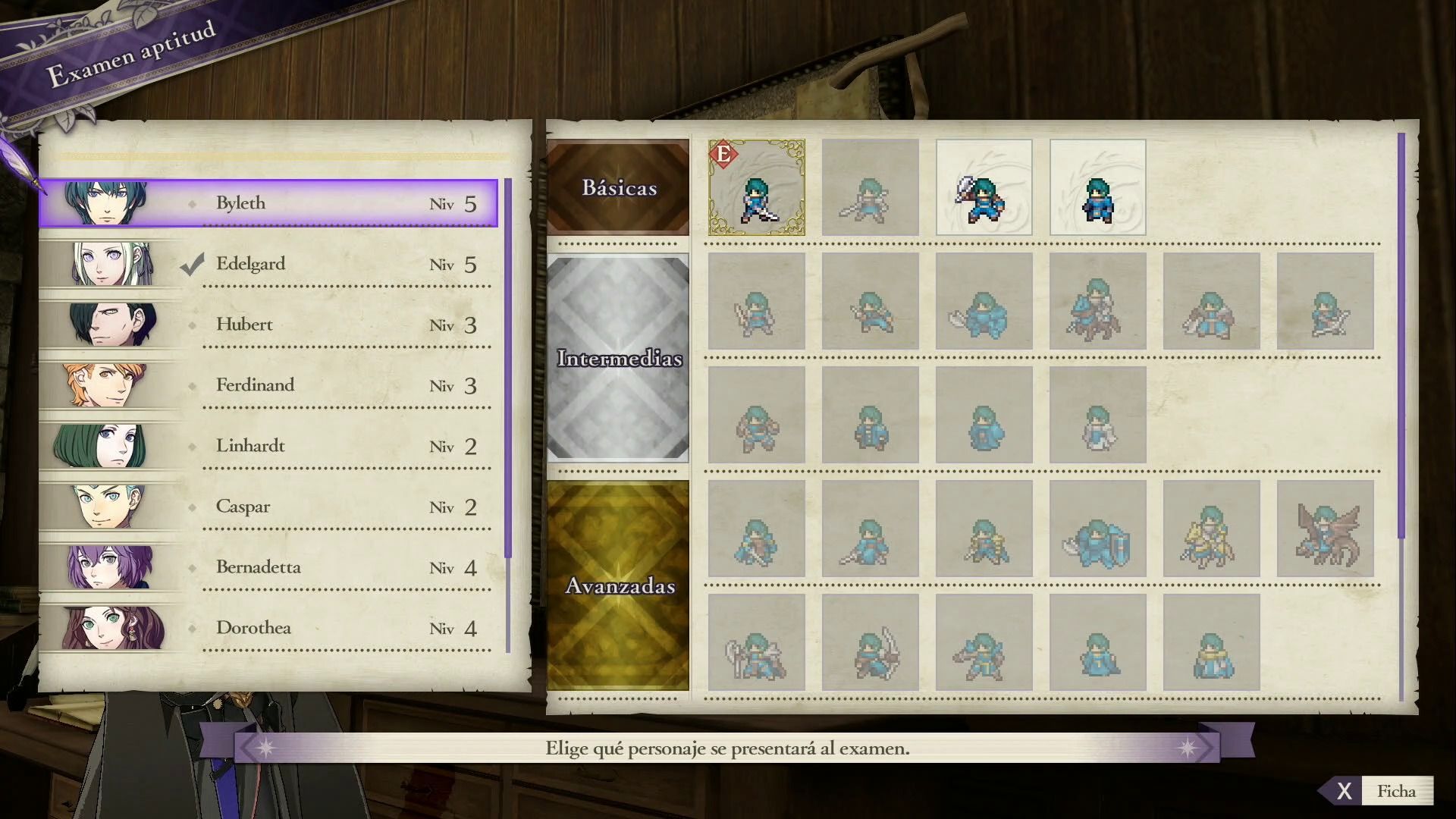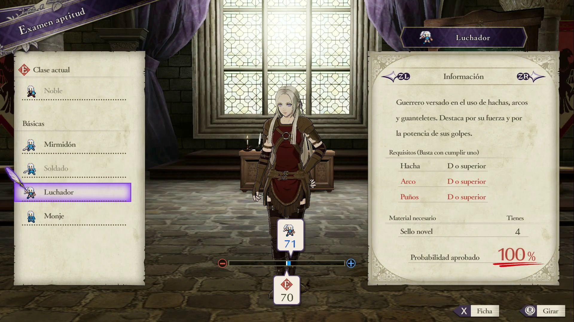 Por ejemplo, si queremos que uno de nuestros estudiantes sea jinete tendremos que mejorar su dominio de la lanza y de la equitación hasta un determinado grado, además de ser nivel 10 al tratarse de una clase intermedia. Cuanto mayor sea la destreza que tenga con estas disciplinas, más posibilidades de aprobar tendrá, algo que se nos indica con un porcentaje antes de realizar el examen.